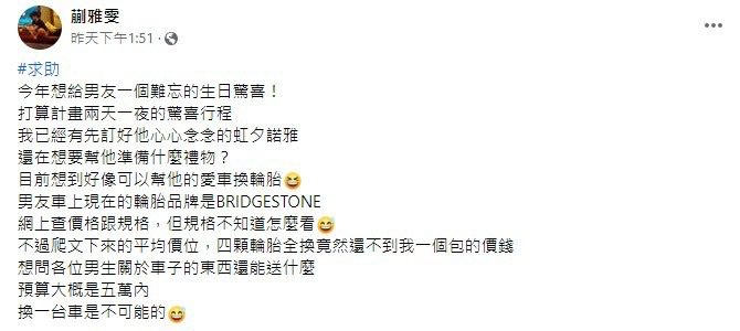 近日,一名女網友在FB爆廢公社上分享了她對男友生日禮物的精心策劃,引起了眾多網友的討論。除了計畫了一趟難忘的兩天一夜驚喜之旅,她特別考慮了男友愛車的需求,決定送給他一套新的普利司通輪胎。