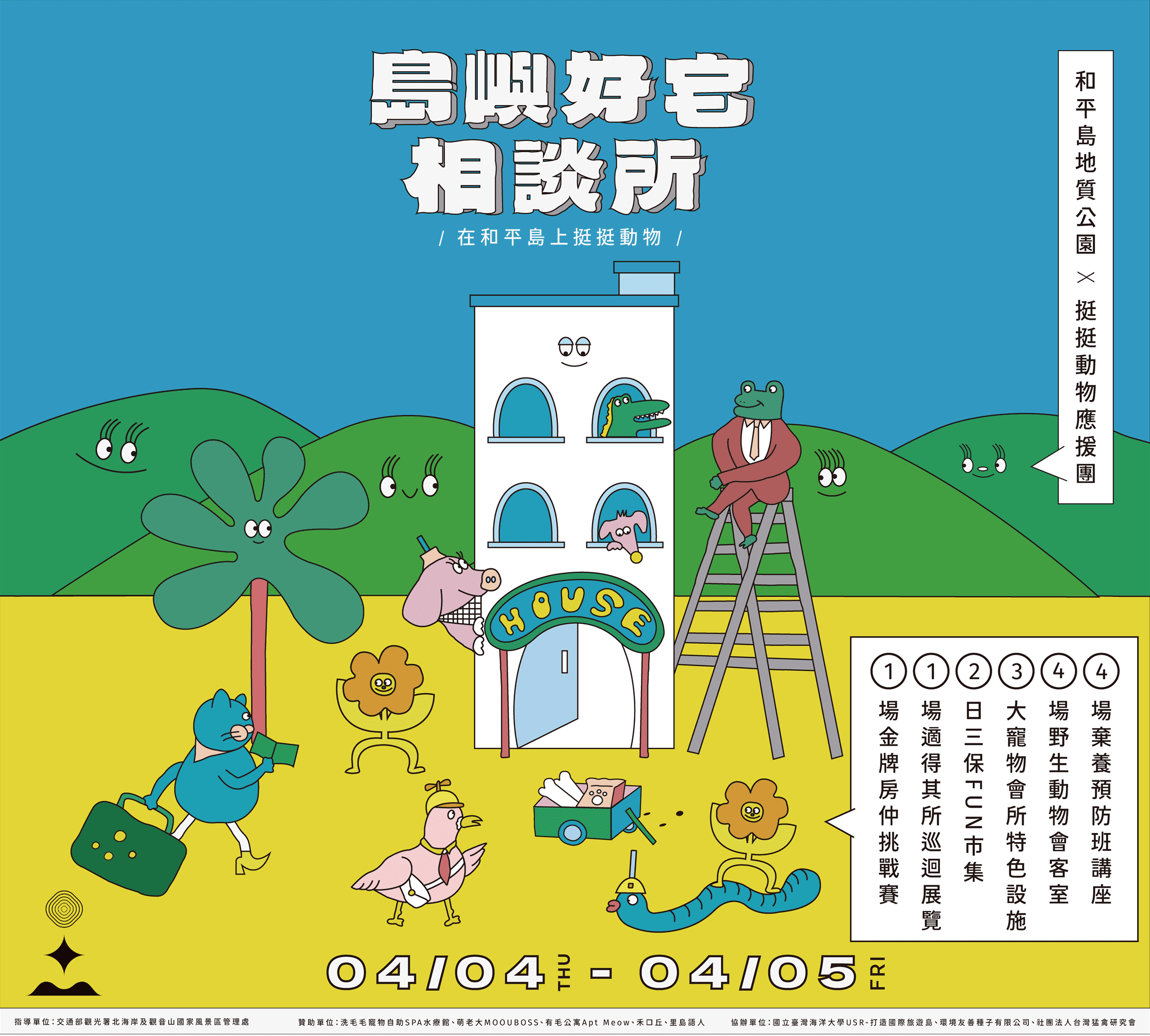和平島地質公園與挺挺動物應援團在連續假期頭二天(4月4日至4月5日)舉辦島嶼好宅相談所,聚集許多有趣的活動,讓大家對動物更加了解,推出「寵物免費,1位主人門票半價」的優惠,讓寵物帶著主人一起到和平島地質公園參與豐富趣味的活動。