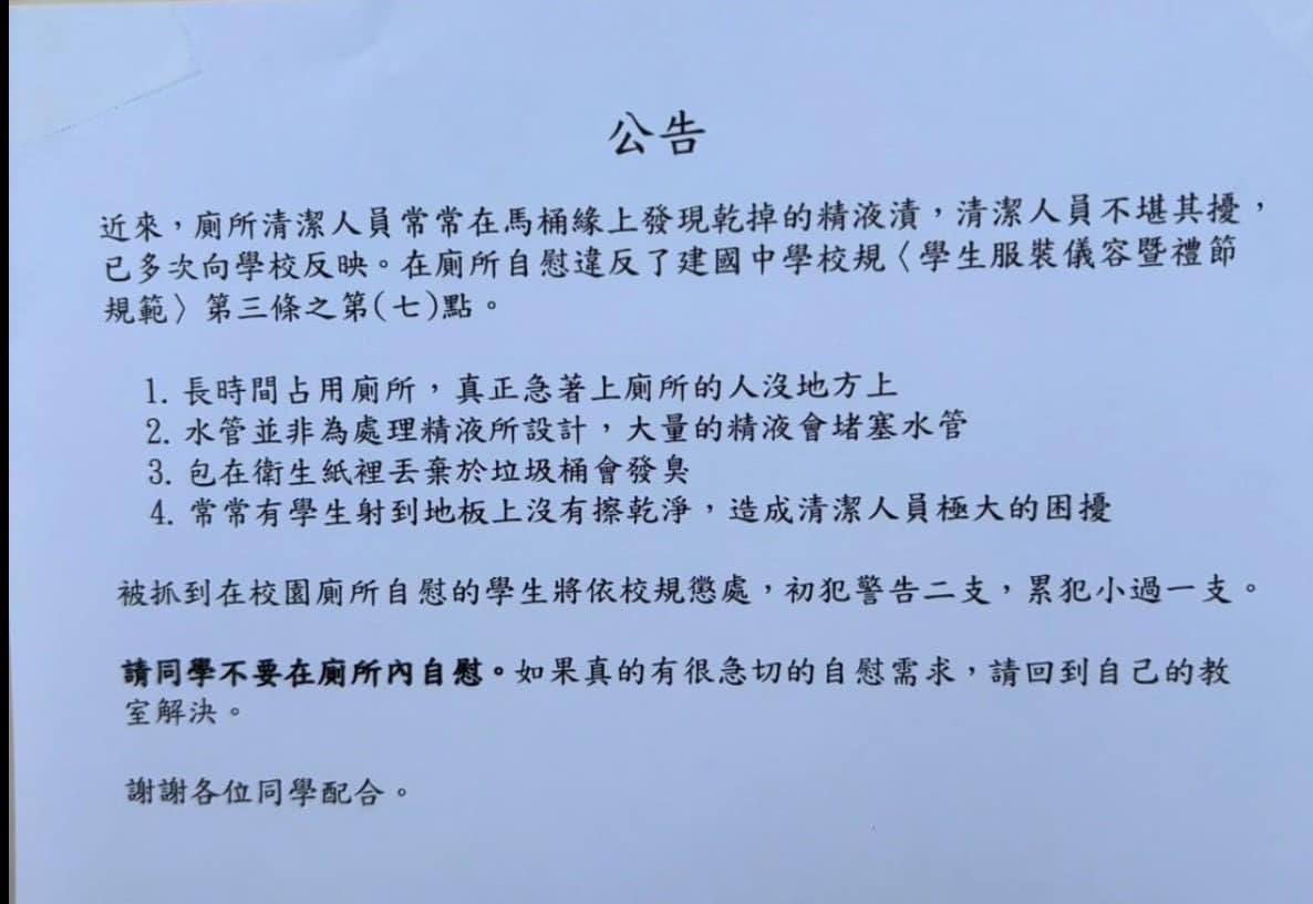 繼歌手黃明志愚人節開死訊玩笑,在台灣第一學府建國中學昨日則傳出在男廁看到一張公告,內容指出,廁所清潔人員常在馬桶緣上發現乾掉的精液漬,不堪其擾,這樣的行為違反《學生服裝儀容暨禮節規範》第三條之第七點,長時間占用廁所也會讓急著上廁所的人沒地方上;而且「水管並非為處理精液所設計,大量的精液會堵塞水管」,「若真的有很急切的需求,請回到自己教室處理」。網友們對於這樣的公告直呼笑翻,但也有人馬上識破是惡作劇。