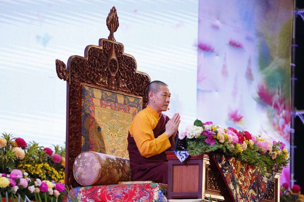 盛大的浴佛祈福盛典開場即由曼妙的「飛天舞集」敦煌舞舞蹈團隊,展演一場與慈悲意境完美結合的視聽饗宴––「千手觀音」舞蹈!恭迎慈悲 龍德上師親臨會場,以法語甘露加持大眾,更於吉祥因緣傳授《伏藏-極樂淨土 長壽佛密法》,簡明易懂的儀軌富藏偉大阿彌陀佛的加持與功德,令受持者增福延壽,締結極樂淨土殊勝法緣。慈悲 龍德上師偕同貴賓浴佛,為聖誕佛獻上香花。莊嚴的壇城上浴佛缽並排齊列,體現出觀音山道場顯密圓融的恢弘宗風,與會大眾一位位上前浴佛,一杓淨水,洗滌煩惱愁憂,惠予大眾安定心靈的正向能量。