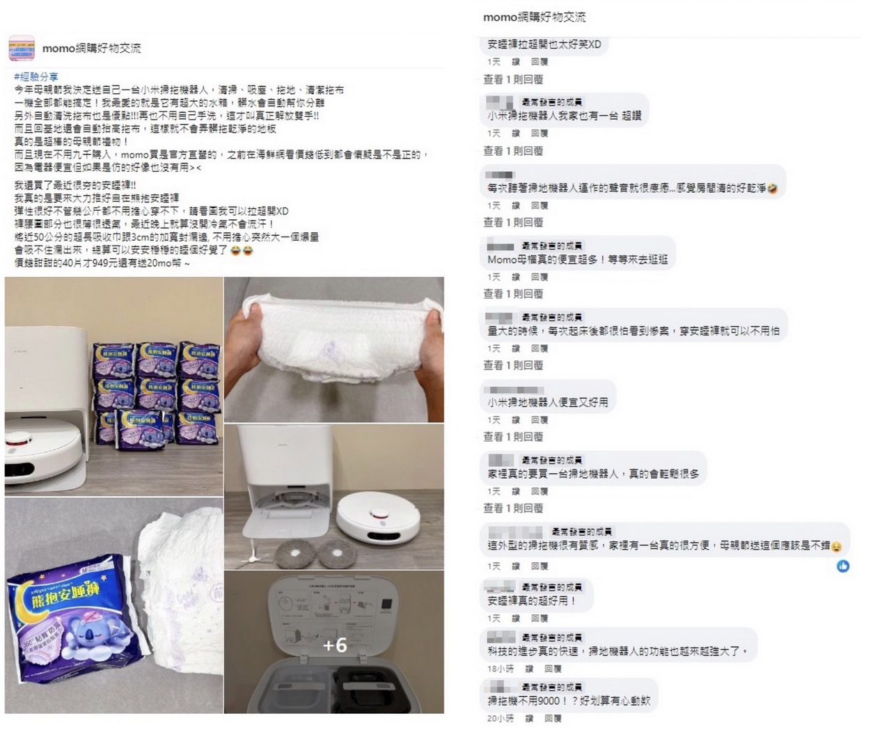 網友推薦的兩款商品,也在社團中引起熱烈討論「安睡褲根本是量大的福音,我也都會趁活動買起來」、「 大品牌母檔活動momo應該會下殺很多!立刻打開來看看」、「 每次看掃地機器人工作,就覺得很療癒」、「我也喜歡穿好自在的安睡褲,透氣很好不會覺得悶悶的」、「想問小米折扣完多少啊?」。