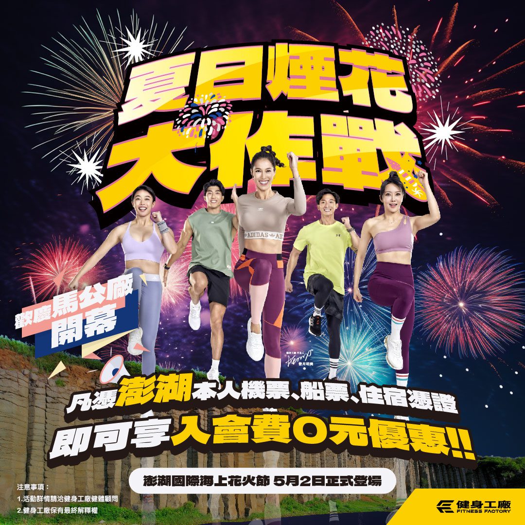 「2024澎湖國際海上花火節」特別延長到七月底,期望搶攻暑期觀光人潮,為澎湖帶來一波觀光經濟浪潮。健身工廠因應花火節活動推出「夏日煙花大作戰」專案優惠方案,凡持通往澎湖的本人機票、船票、澎湖住宿憑證,享免入會費的活動,輕鬆省下1500元的入會費用,開啟健康生活的全新篇章!所有好朋友們參加花火節,開懷暢飲大快朵頤之餘,進入健身工廠馬公廠,超過400坪開闊視野,超美視覺,質感運動形象大加分,『光線能穿過神經通路並影響大腦中的松果體』,健身工廠室內的藍光可以幫助提升生產力,黃光可以讓心情製造更多『正面能量』;健身,被視為自律、克制等「進步」理念的體現,澎湖人們期待著在這個「勞其筋骨」的場合,消除身體焦慮和健康;夥伴們,出發澎湖,一起前往馬公廠冒險吧!指引你尋找屬於你的ONE PIECE!