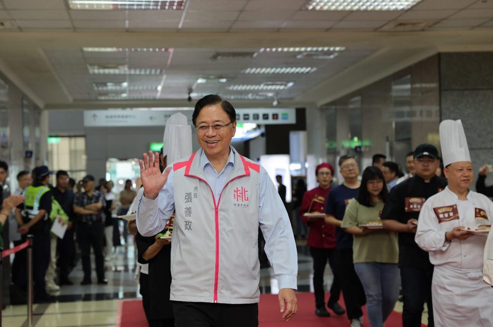 ▲桃園市長張善政(中)與本屆桃園脆皮燒肉(節)爭霸賽評審長司宛春(左一),進行脆皮燒肉料理示範秀。(圖/桃園市政府經濟發展局提供)
