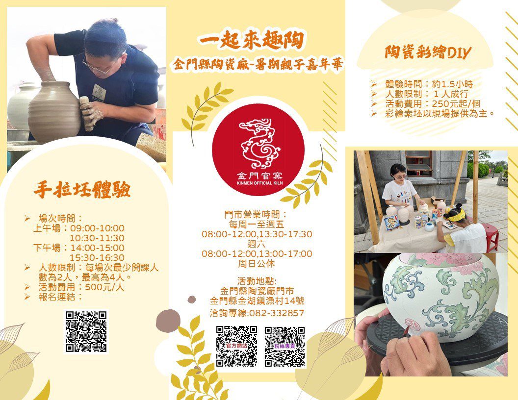 「陶瓷彩繪DIY活動」適合各年齡層,材料費 250元起/個,於門市開放時間皆可預約體驗,體驗時間須預留約1.5小時左右;「手拉坯體驗活動」場次時間為每週一至六上午兩場時段:09:00-10:00、10:30-11:30,下午兩場時段:14:00-15:00、15:30-16:30,考量學員手部穩定度,建議6歲以上較適合本課程(6-12歲需一名家長陪同),如需協助老師將共同協助完成作品,費用為500元/人,手拉坯體驗活動採預約制,報名網址為 https://reurl.cc/AjYL9K ,名額有限,需於課前3天預約。暑假期間遊客眾多,建議及早規畫行程預約。如需了解更多活動詳情或預約參加,請聯繫金門縣陶瓷廠報名專線:082-332857。