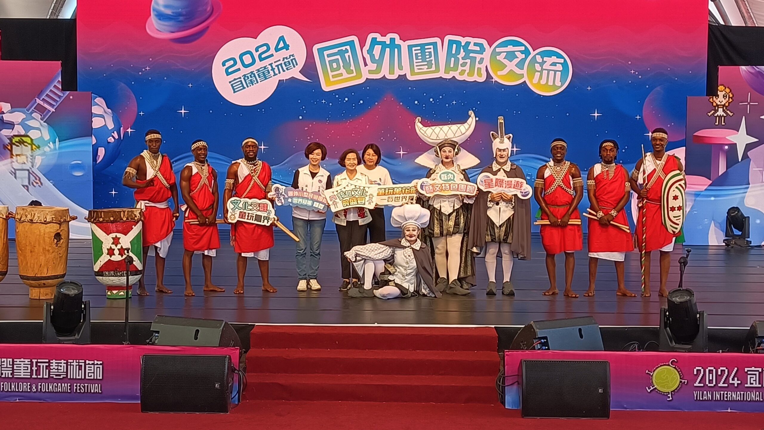 2024宜蘭國際童玩藝術節7月17日邀請到非洲國家「蒲隆地」阿卡亞茲維舞團,以及澳洲「Born in a Taxi」劇團表演舞蹈,縣長林姿妙不但戴上皇冠,還拿起了盾牌跳起了傳統的鼓舞,邀請大家一起來參加精彩的童玩節。
