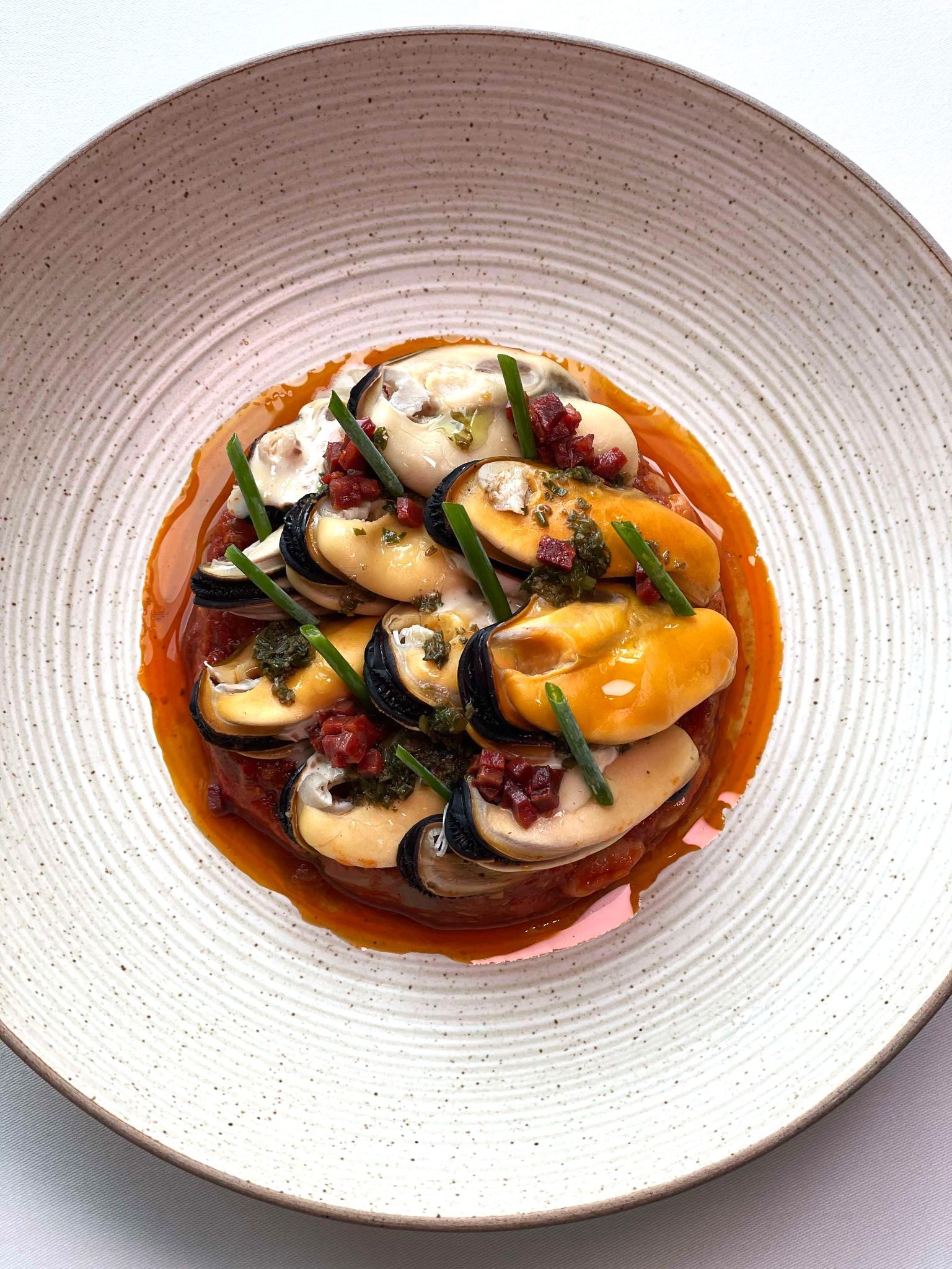 夏季盛產的馬祖淡菜肥美脆口,蒸煮後以直火炭烤增添煙熏香氣。搭配北非經典料理夏卡蘇卡番茄紅醬,將淡菜湯汁中加入多種香料和蔬菜,並選用三種番茄來增添酸甜層次,與法國白豆一同慢火燉煮至軟硬適中。清甜酸爽的燉菜醬汁襯托出淡菜的鮮美,白豆的口感帶來驚喜。而海鮮重頭戲莫過於將胭脂蝦、龍蝦殼與豐富蔬菜熬煮成濃郁高湯,再加入大量櫻桃番茄,以小火慢煮釋放自然酸甜滋味。將細扁麵與醬汁充分拌炒至入味,並加入乾辣椒與油封蒜頭提升辛香層次。搭配整隻新鮮龍蝦直火炭烤,肉質飽滿且彈牙,每一口皆充滿海洋的鮮美。上桌後現刨義大利帕馬森起司,增添鹹香奶味,麵條軟硬適中的口感與風味鮮甜的尾韻令人著迷不已。