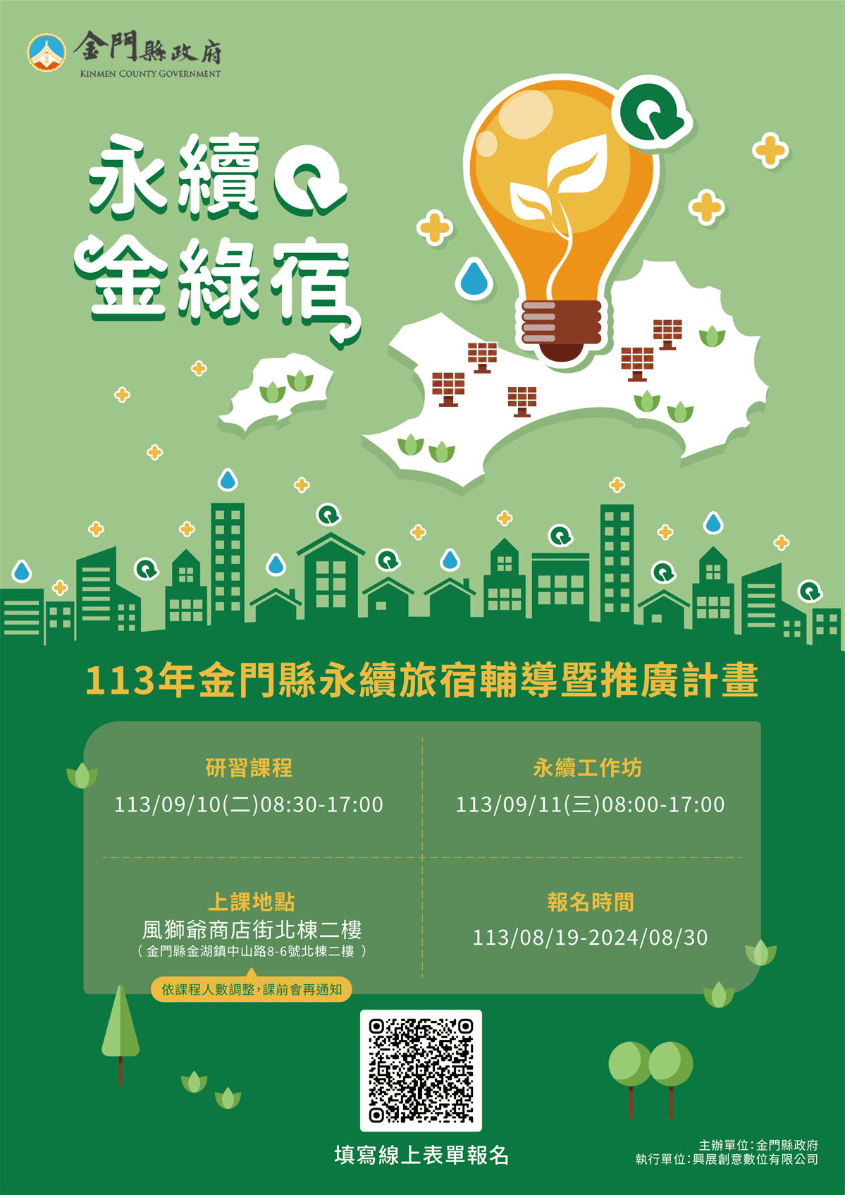 「永續旅宿」標章研習課程將於9月9日及9月10日於風獅爺商店街展開,活動將於8月19日到8月30日開放報名。歡迎地區合法旅宿業者踴躍報名參加,把握報名機會,共同攜手打造金門觀光永續之島,成為永續旅遊新典範。