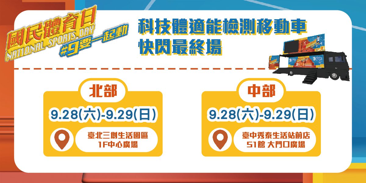 活動現場可以透過專業體適能檢測員專指導,進行23~64歲的免費科技體適能檢測,可以了解以自身的身體組成分析、肌力適能、柔軟度、心肺適能,邀請民眾透過定期體適能檢測去認識自己的身體狀況,再藉由持續保持日常的運動訓練與關注健康生活習慣,才能常保身心健康。科技體適能檢測移動車, 9月第4週(28日、29日),最終場將於臺北三創生活園區及臺中站前秀泰S1館前廣場,邀請民眾可以一同免費參與檢測,一同響應「運動99、健康久久」提升全民運動風氣。