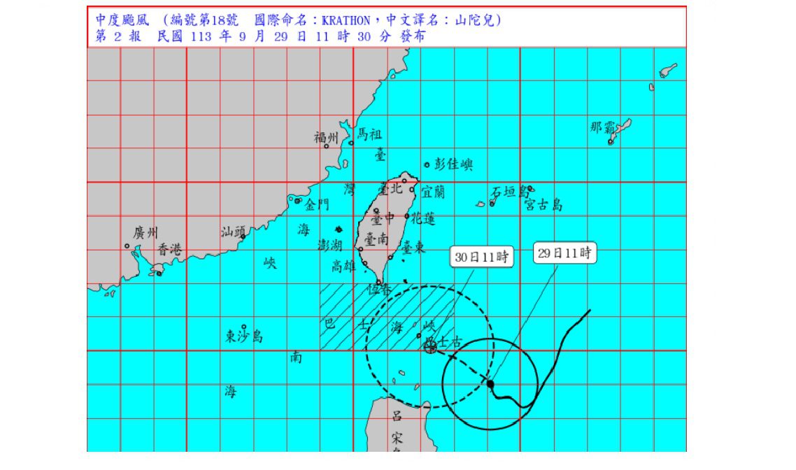 中颱山陀兒持續接近台灣,中央氣象署表示,山陀兒移動速度慢,預測路徑更貼近台灣東半部陸地,暴風圈也持續擴大,強度繼續增強中。10月1日周二與2日周三是距離台灣最近、影響最明顯的時間,也請各地嚴防強風豪雨。