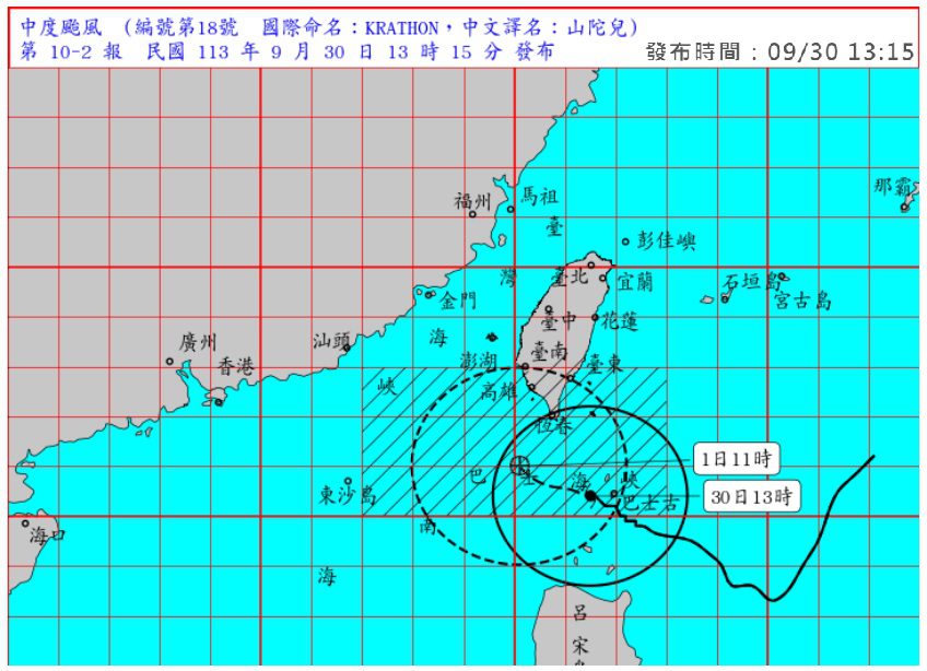 中度颱風山陀兒朝台灣逼近,中央氣象署已擴大海上警戒範圍,暴風圈最快今9月30日下半天觸及陸地,預估周二、周三颱風距離台灣最近,暴風圈可能會壟罩全台。對此,氣象署今天凌晨發布了陸上颱風警報,首波警戒區域為恆春半島及台東。