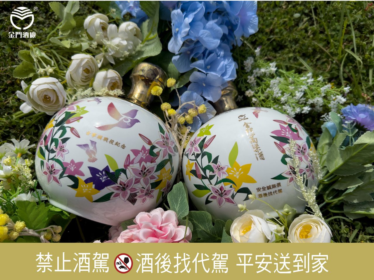 金門酒廠 吳昆璋董事長表示,金門酒廠能夠立足金門,並以精湛酒藝名揚國際,成為東方白酒第一品牌,一切基石皆來自「和平」,人們才能安居樂業,發揮長才,創造繁榮昌盛。因此,時逢古寧頭戰役75週年,金門酒廠特別用心規劃,隆重推出《1L-58度 古寧頭戰役75週年紀念酒》,並以象徵無瑕的純白瓷瓶為底,環繞著色彩繽紛的百合花與展翅翱翔的和平鴿,呈現戰爭過後對和平與自由的追求。百合花語代表純潔、高貴、優雅,和平鴿象徵著友誼、團結與聖潔。瓶身上飛翔的和平鴿承載著「75」這個重要的數字,象徵著75年來,因珍視和平而使繁榮之花處處綻放。