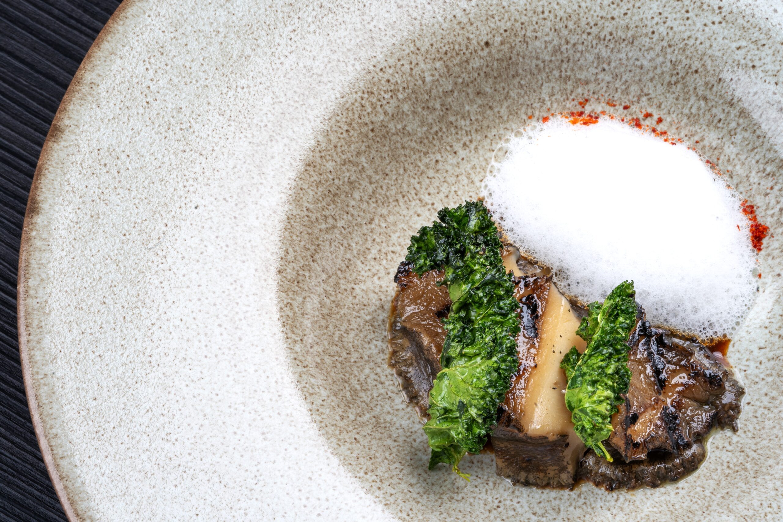 有別於煨鮑魚熱菜,改以烤鮑魚作為主軸,使用台灣東北角九孔鮑採炭烤方式製作,炭烤產生的少許油脂使其完美平衡八角雪莉醋的強酸調及濃郁八角味;辣根醬以泡沫質地呈現,搭配烘乾的羽衣甘藍做為味蕾的破口,當鮑魚的膠質包覆了八角雪莉醋的陳年底韻與辣根醬淡淡嗆辣香氣在口中呈現完整的味覺閉環,藉由脆口的羽衣甘藍提升味蕾,將味道達到絕佳的平衡作用。