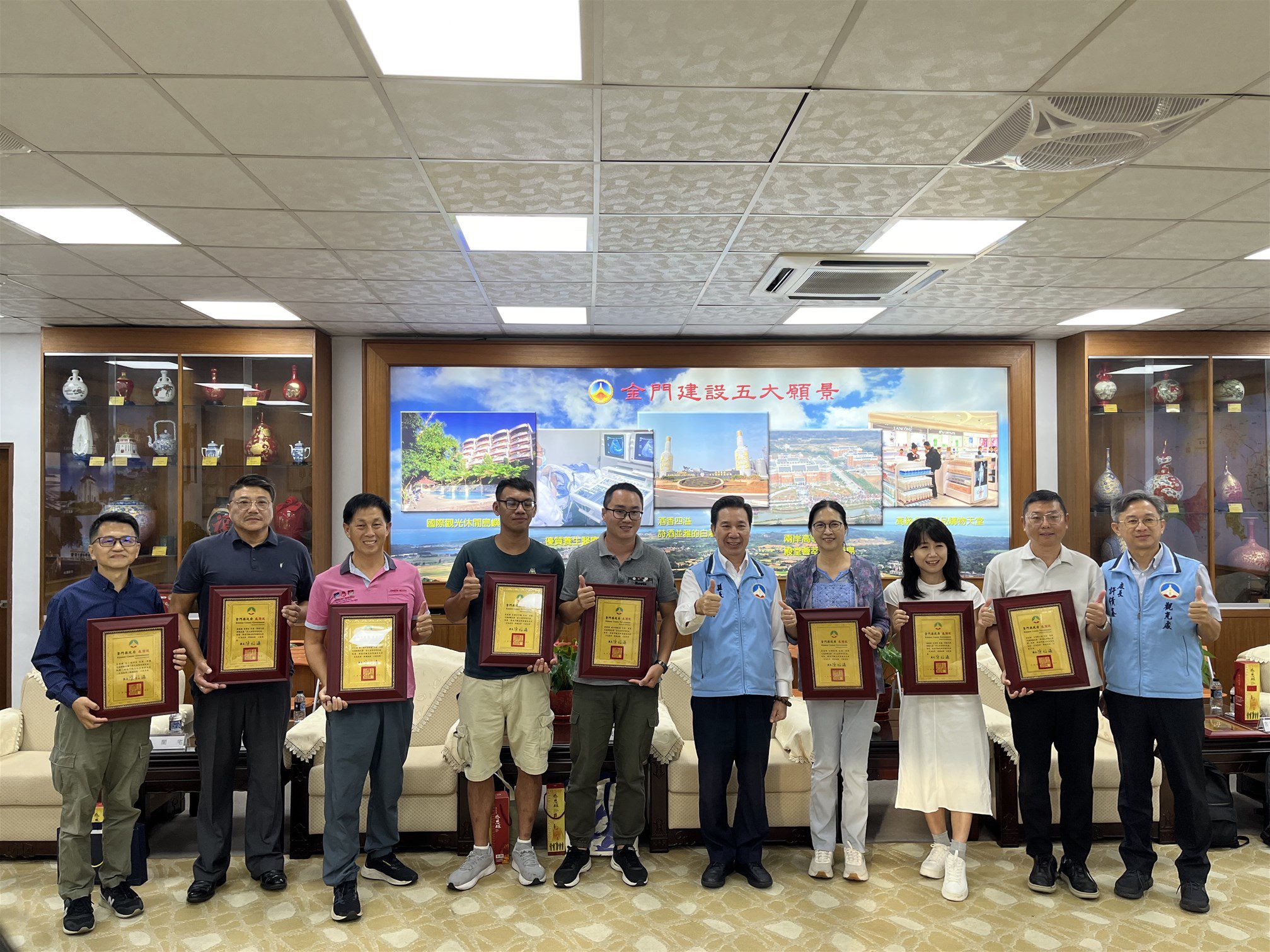 陳福海縣長於11月4日下午在縣長室接見金門縣榮獲交通部觀光署百大金質「好客民宿」及「第一屆台灣觀光金獎」業者,除了感謝8家業者在全台灣1,700多家好客民宿中脫穎而出,成為金質好客民宿,並對其致力地區觀光形象增添不少光彩努力與付出給予肯定。