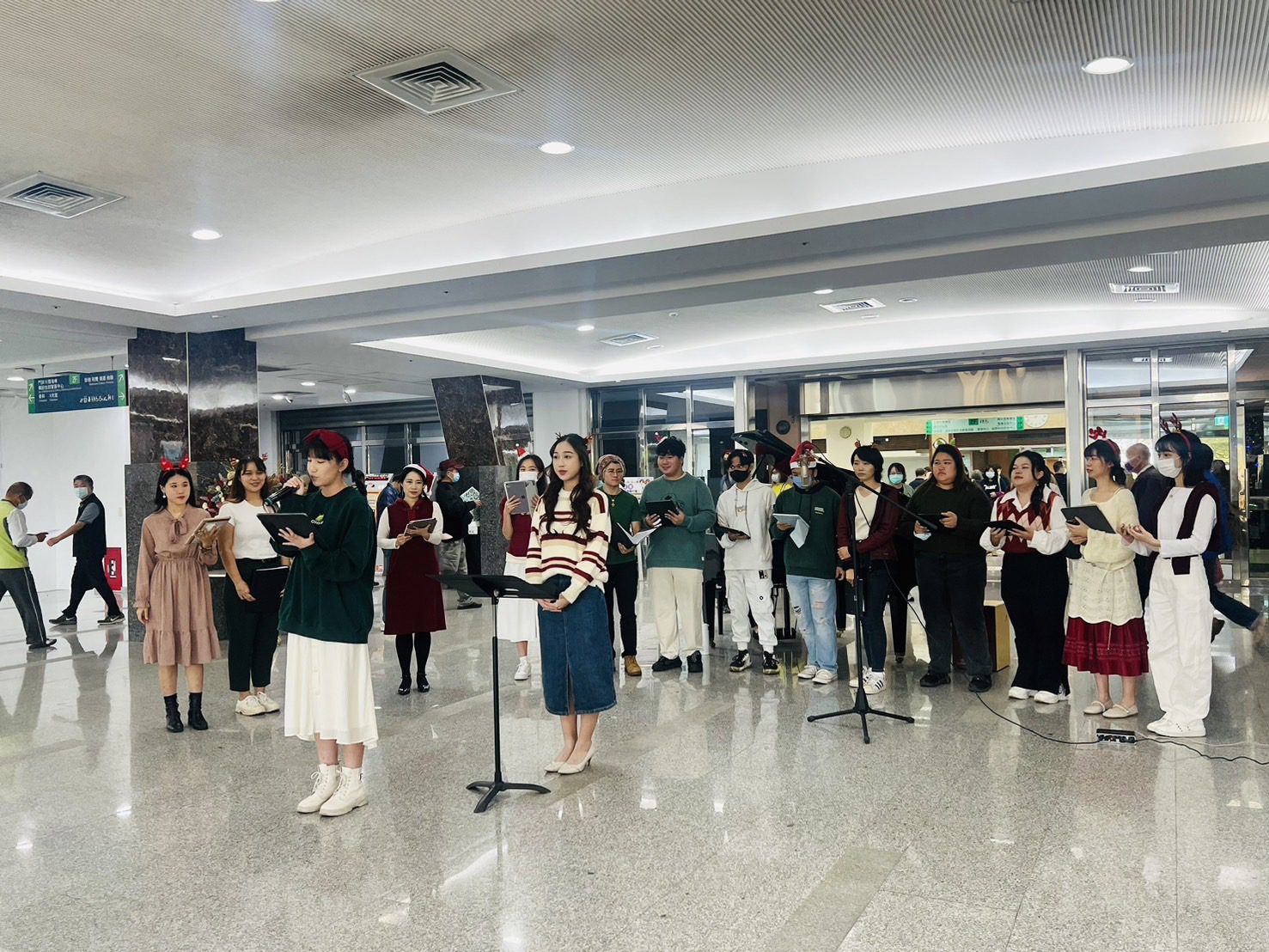 東海大學音樂系師生在一旁耶誕樹的陪襯下,很快地就營造出溫馨氣氛。透過這場音樂饗宴,盼帶給病人和家屬堅韌的力量。在月亮代表我的心、We Wish You A Merry Christmas等西洋樂曲中,現場隨即感受到濃濃耶誕氣氛,撫慰人心。