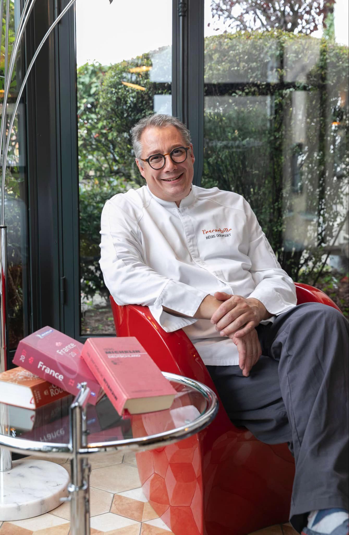 Régis Douysset畢業於薩瓦萊芒酒店學校位於美麗的日內瓦湖旁,培養出無數的優秀米其林主廚,畢業後以優越成績前往德國米其林三星餐廳工作打穩馬步,直到31歲時才創立I’escarbille,並順利在兩年後獲得法國米其林一星餐廳,至此連續18年在法國不間斷摘下米其林星星18顆殊榮。隔年第二次摘星時,法國米其林總監更親自前來賞味令他印象深刻;而讓Régis Douysset又驚又喜的是,法國前總統歐蘭德從政生涯曾兩度光顧的光榮記錄。Régis Douysset回憶道,75張座位的I’escarbille經常高朋滿座,當時歐蘭德總統幕僚訂位是滿座中,直到日期接近前兩天告知有位子,當歐蘭德出現在餐廳門口時,Régis Douysset方才得知訂位人是政治聞人歐蘭德。歐蘭德非常喜歡布列塔尼魚與苦苣的滋味,讚嘆其烹調手法十分獨特。
