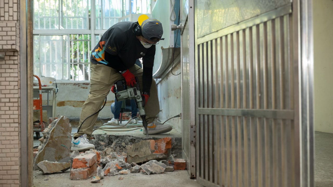 為協助高職部學生順利接軌職場,本次公益修繕鎖定三間職能教室與電腦教室,不僅要打造無障礙空間,更要完善設備,提升教學品質,以符合學生未來發展所需。遠雄志工抵達後立刻分組動工,負責打鑿兩間教室講台的志工們三人一組,用打石機分階段鑿破水泥講台,再逐一搬開碎石。另一旁電腦教室則多了一組打地板溝的志工,沿著規劃好的路徑,將地板鑿出一道道溝槽,以便未來將電線與電腦線路埋在地面下,確保學生行走安全性。除了教室空間的優化,手工藝教室與生活家事教室內,也添設可收納用品或器具的櫃子,看似簡單的收納櫃,可是志工們挽起袖子從無到有製作完成,一片片的木板打釘、鎖螺絲、貼皮,最後放上層架隔板,每一個步驟,都蘊含著志工們對中聰學子的愛護。
