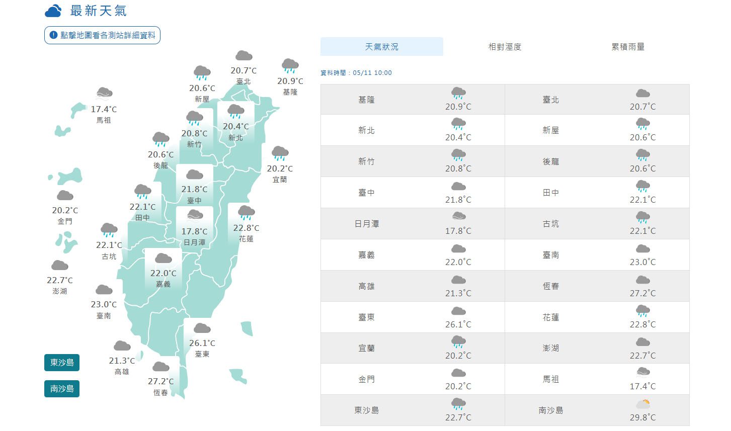 中央氣象署指出,今天仍受鋒面影響,各地天氣不穩,容易有陣雨或雷雨,並有大雨發生的機率,尤其是中南部、台東地區及各地山區有局部豪雨發生的機率,慎防「劇烈天氣」的發生。溫度方面,東北季風增強,各地氣溫會再下降,北部、宜蘭攝氏18至22度,中部、花蓮20至24度,南部、台東22至27度。周一鋒面在巴士海峽繼續南移,南台灣雨後多雲,其他地區先後轉晴,白天氣溫明顯回升、早晚偏涼。