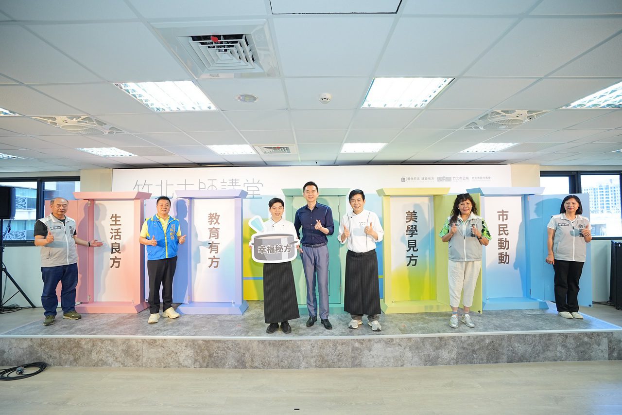 2025竹北大師講堂15日於竹北市民活動中心北崙館盛大開課!承襲去年大師講堂精神,網羅各領域的大師共聚竹北。記者會活動特別以「市民料理」為題,邀請知名型男主廚吳秉承父子檔,讓首場竹北大師講堂更添風味。