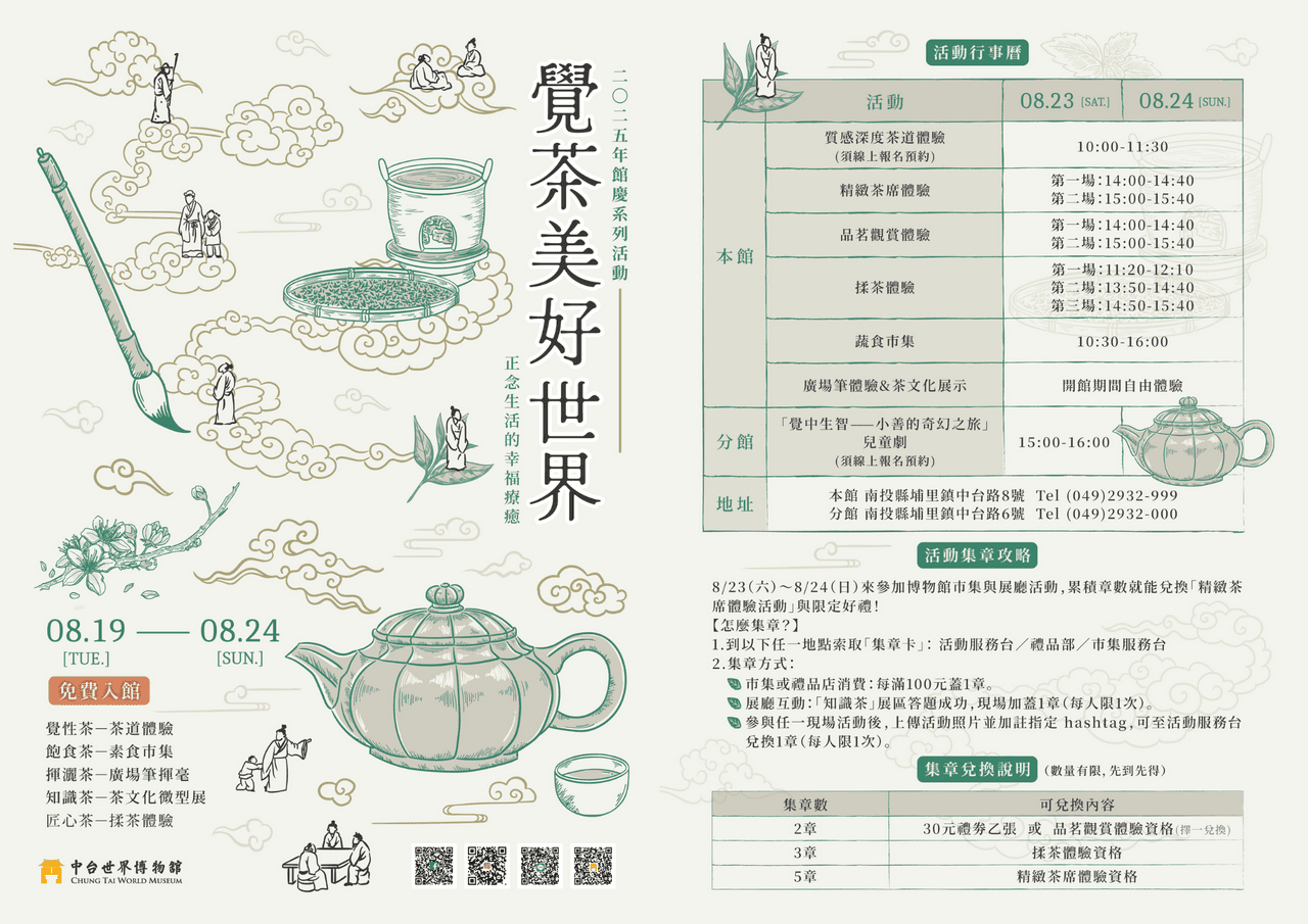 2025年中台世界博物館歡慶9週年,將以「茶」為主軸推出年度館慶活動「覺茶美好世界」,串聯禪茶文化與生活美學,從品茗、揉茶、書寫到蔬食市集,打造五感沉浸式互動體驗。活動邀請民眾於日常中練習覺察、靜心,體會「茶即禪」的生活智慧。8月19日(二)至8月24日(日)全館免費開放參觀,8月23日(六)與24日(日)主場活動登場,戶外廣場設有特色蔬食市集,並推出集章換體驗活動,歡迎親子共遊。