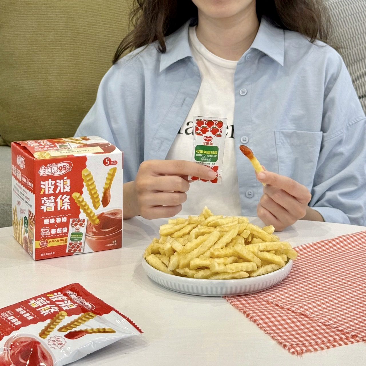 這款聯名不只是宵夜時段的完美救星,也非常適合化身家庭親子時光的小點心,將卡廸那95℃波浪薯條和可果美蕃茄醬擺盤上桌,在家就能享受速食店般的口味,小孩們一根接一根吃得開心,大人也能輕鬆享受。