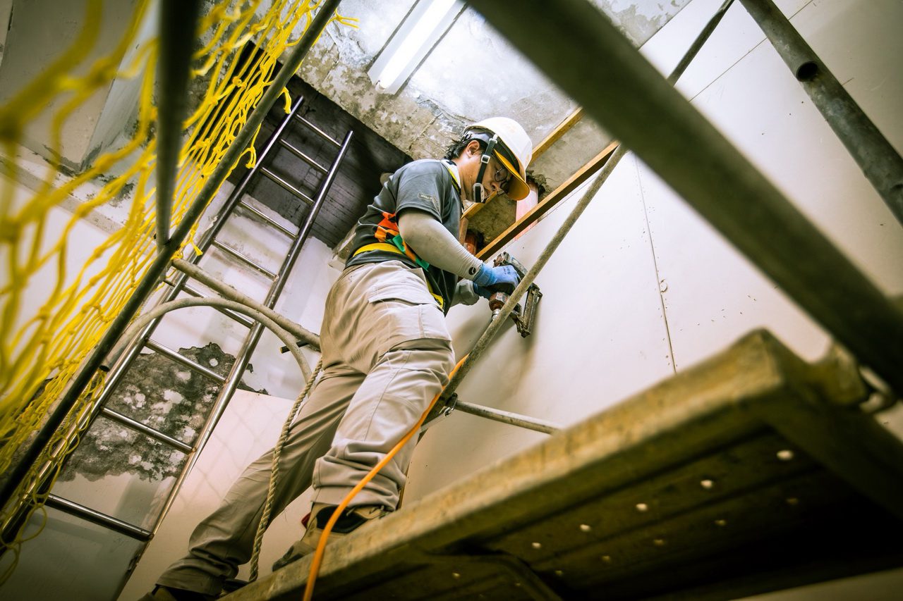 此次修繕最主要項目即是屋突水塔間的防水施作,九名志工一組前往頂樓,先將鋼筋外露處的破損水泥剝除後,再依序噴灑防鏽藥劑、刷防水漆,最後以水泥砂漿塗抹填平凹陷處。頂著逾34度高溫,在水塔間密不透風環境下施作的志工們,每個人的汗水都浸濕了衣服,但由於此處是導致建築漏水的主要原因之一,因此大家們輪流輪班休息,希望可以在最短的時間內,將工項完成,以因應未來雨天時,不會再造成室內淹水。除了建築的防水補強,另一頭在樓下的三人小組志工們,則是針對伸縮縫的天溝進行拆除、清潔接水盤,以讓往後降雨的積水洩水通暢。同時,為了讓戶外餐車動線順暢,其餘志工則針對地磚進行修繕,將破損地磚打除、貼新磚,再塗上水性PU,以確保地面平整。