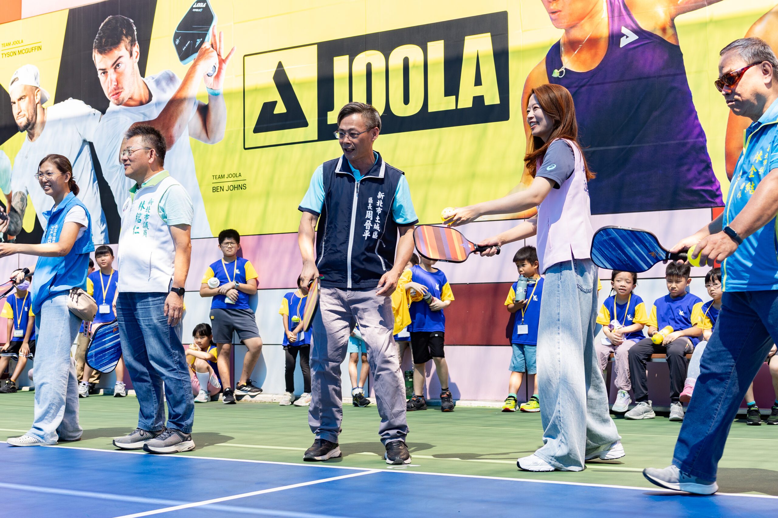 開幕典禮包括了土城區區長周晉平、土城區議員黃永昌、土城區議員林銘仁、土城區議員江怡臻、新北市匹克球協會理事長陳雅玲,以及 JOOLA 總監王韋翔等人都紛紛出席,共同見證公益營隊的啟動。貴賓們不僅致詞勉勵學童,更親自與孩子們互動,現場氣氛溫馨熱鬧,充分展現社會各界對弱勢教育的重視與支持。典禮中由新北市匹克球協會理事長陳雅玲親自指導匹克球,陪伴學童體驗運動樂趣,為營隊揭開充滿活力的序幕。