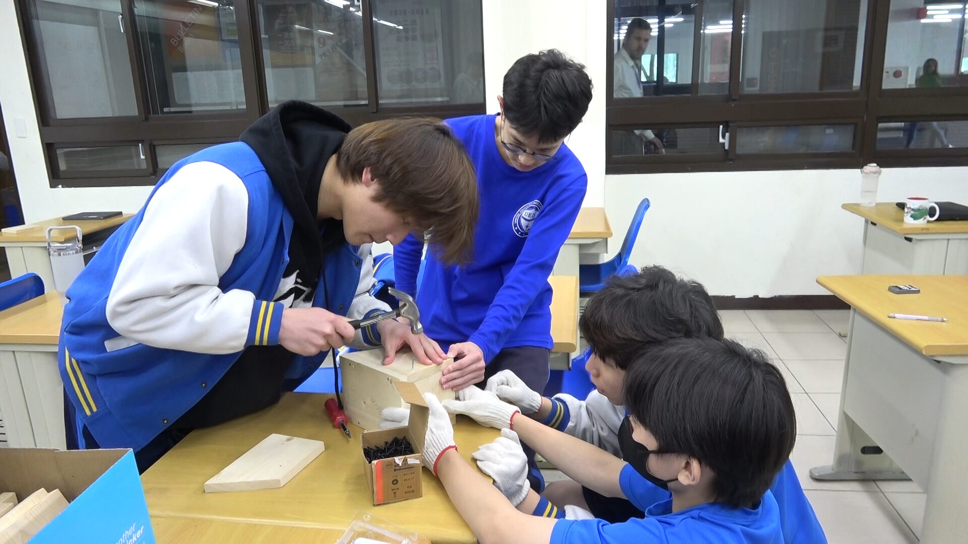 在外籍老師的帶領下,學生們神情專注的親手裁切木材。由於校園裡經常有小鳥棲息,但因為缺乏隱蔽,鳥蛋或幼鳥常遭受八哥或珠頸斑鳩的攻擊。為了幫助這些小鄰居有個安全的家,UEIS的外籍教師就以PBL(Problem/Project-Based Learning)問題與專題導向學習的教學方式,帶領學生們一起打造出堅固且洞口大小剛好的「安全鳥窩」。