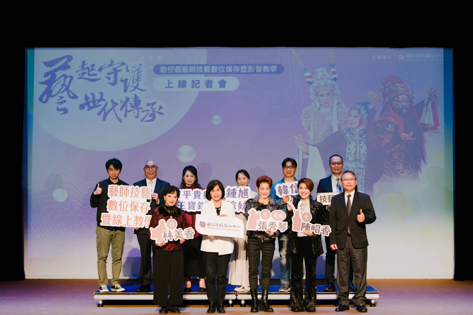 為保存及傳承傳統表演藝術珍貴技藝,國立傳統藝術中心持續系統性地針對不同行當藝師的拿手劇目進行數位技藝保存及示範解說,發揮紀錄、保存、觀賞、教學與研究等多重功能。繼首期完成小咪、孫榮輝、許亞芬、張孟逸四位藝師的技藝紀錄後,第二期續完成林美香、陳昭香、張秀琴三位歌仔戲資深藝師之技藝保存紀錄,傳藝中心於3月27日舉辦藝師技藝數位保存上線宣告記者會,林美香、陳昭香、張秀琴三位藝師親臨記者會現場,演示教學戲齣精華,展現藝師們技藝亮點及教學影音特色,最後由傳藝中心陳悅宜主任、三位藝師及計畫顧問一同拉下象徵傳承的卷軸,宣告三位藝師技藝數位保存影音正式上線!