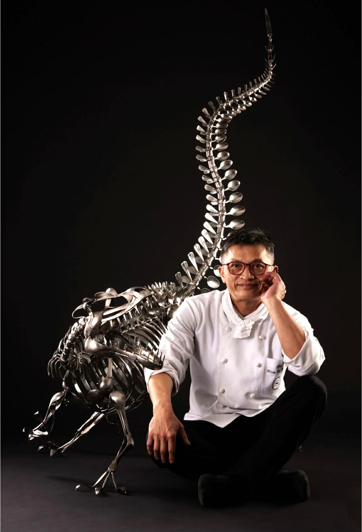 黃銘波的不鏽鋼雕創作迅猛龍高180公分、身長兩米,先有骨架再有恐龍雛形,買小型模型加上拿捏果雕3D基礎,以型取型、形體架式、標本角度,前後創作兩三年時光。選用220根湯匙、水果叉,借重骨幹不銹鋼,特別選用316規格醫療等級、304規格廚具會生鏽、430規格掃把畚箕進行亞焊,研發過程失敗是常態。30公斤重的迅猛龍可以拆解成三座再組裝起來,目前作品已獲多位買家青睞,收藏價值節節高漲。