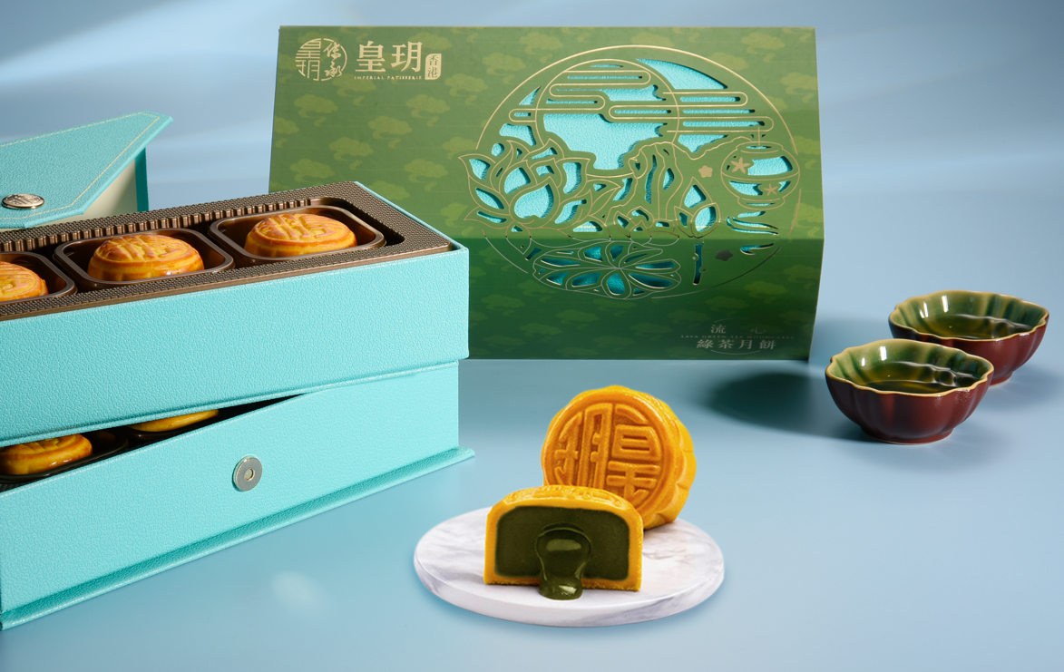 皇玥集團餅藝大師的葉永華師傅很喜歡飲茶,而且有研究茶葉的習慣,這也讓他想去嘗試把茶和月餅結合在一起,期待可以將創新和傳統合二為一。葉師傅特別精心挑選了頂級日本京都綠茶,經過隔水加熱後萃取其精華放入月餅當中;而在綠茶餡料方面,他也是反覆調配,將茶香和奶油香巧妙結合,去掉綠茶的清澀,同時不會讓甜味蓋過了回甘茶香,在常溫底下也一樣湧流的綠茶流心醬,口感倍感絲滑,咬開月餅時,即刻散發出濃郁甘甜的綠茶香氣,層次細緻清新,茶香醇厚。