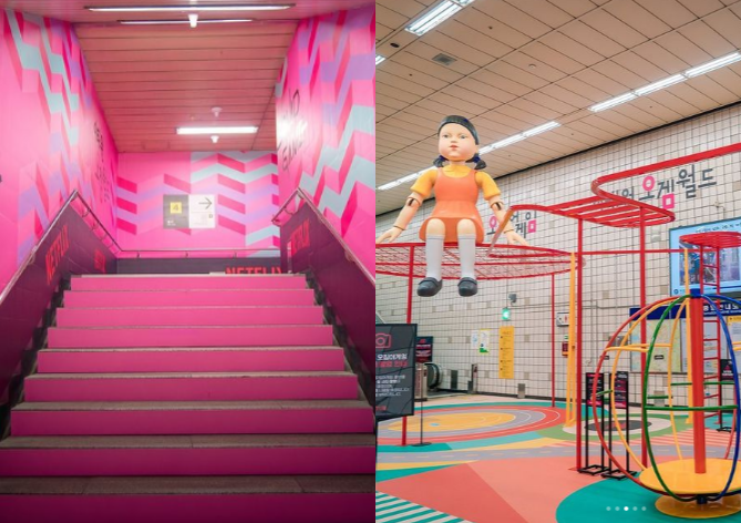 Netflix韓劇《魷魚遊戲》近日人氣爆紅,劇情主要講述負債累累的角色們參與了一場獎金豐厚的神祕遊戲,雖然遊戲殘酷不堪,舉辦的地點卻童趣可愛,充滿五顏六色的遊樂設施。如今這些讓人印象深刻的場景被複製到了韓國黎泰院地鐵站,像是「一二三木頭人」的巨型偵測機器娃娃、裝獎金的小豬撲滿全都可見,民眾在現場還能夠跟執行遊戲的小紅人拍照打卡。