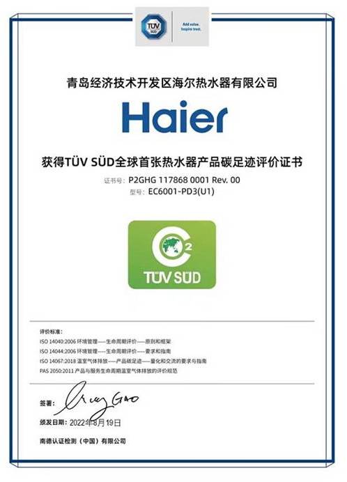 全球首張碳足跡,海爾熱水器萊因集團國際認證