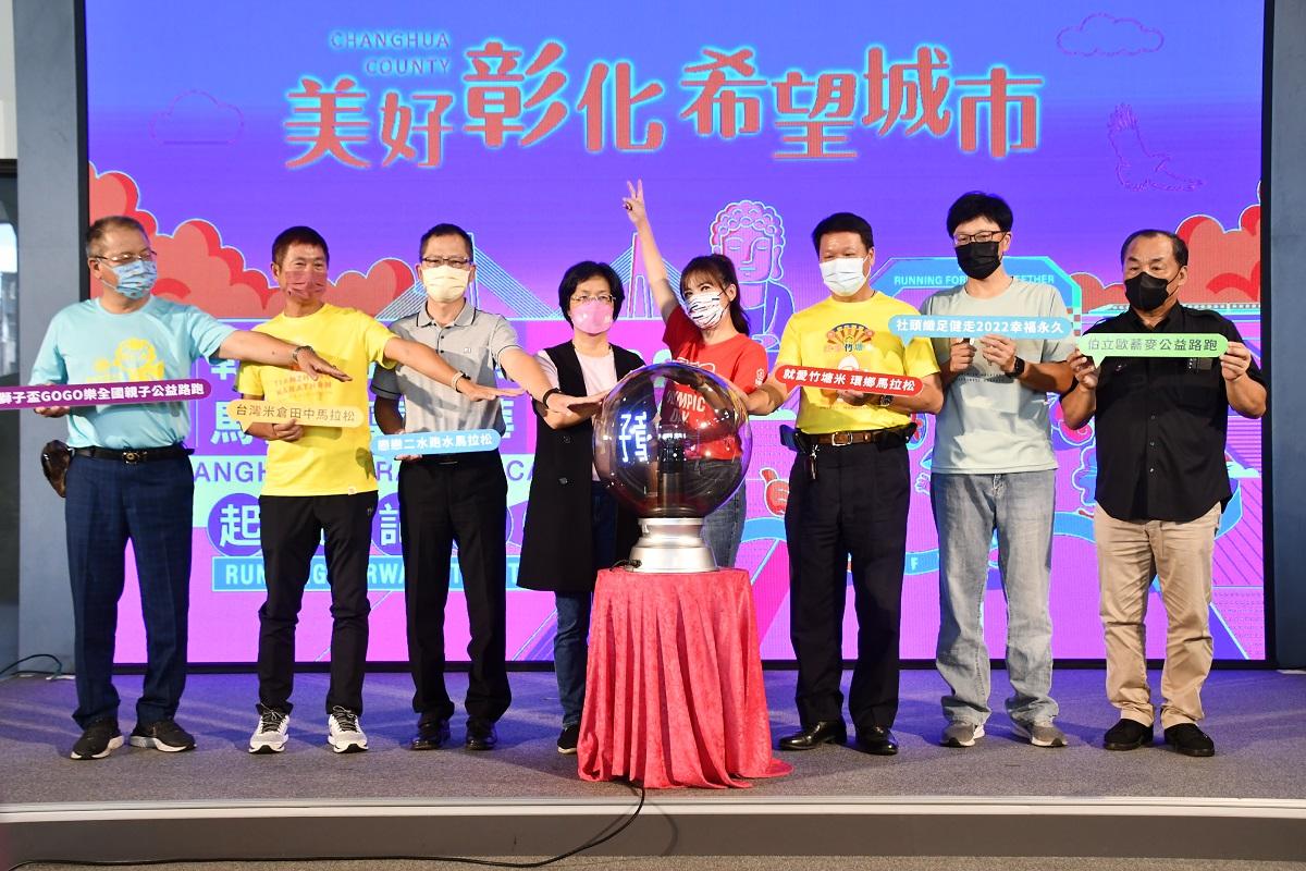 彰化縣政府26日上午舉辦「 2022彰化縣政府馬拉松嘉年華」啟動記者會, 由縣長王惠美正式預告馬拉松賽事啟動,舒康樂活運動協會總幹事鄭宗政、 伯立歐顧問秘書長紀慶堂、喜樂小兒麻痺關懷協會理事長陳忠盛理、員林獅子會長刑施賢等人與會,縣府串連縣內6場具有在地特色的馬拉松賽事,首場為10月9日「2022就愛竹塘米半程環鄉馬拉松」, 接著10月15日「2022彰化社頭織足健走」、10月30日「 2022員林市獅子盃親子路跑」、11月6日「2022戀戀二水 跑水馬拉松」、11月13日「台灣米倉 田中馬拉松」、12月4日「二林伯立歐蕎麥公益路跑」, 歡迎大家一起來共襄盛舉。