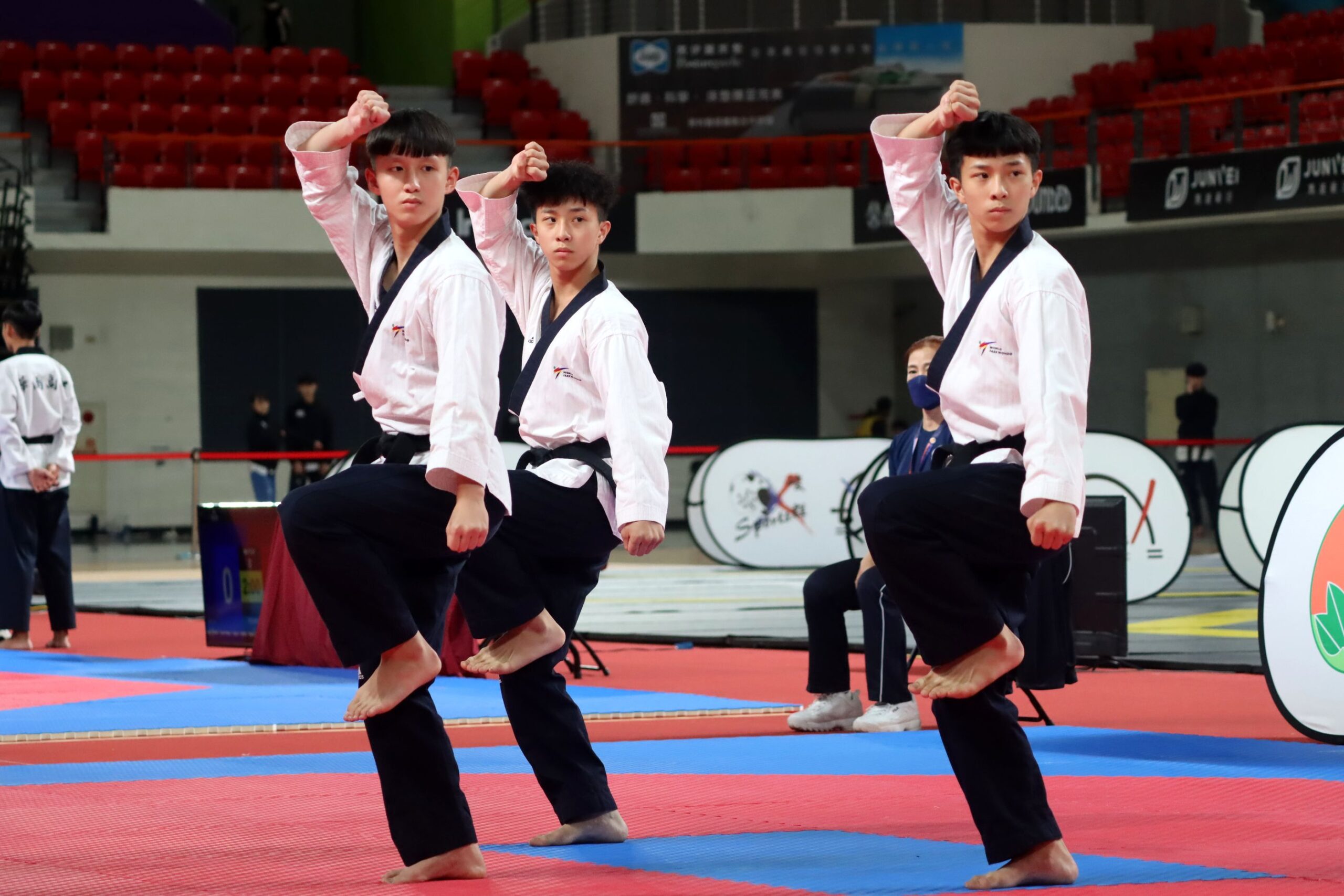 男子團體3人組,松山家商的王敍名/王敍帆/鄧文智壓軸出場,第一品勢就以整齊精實的動作拿下7.6分,第二品勢的組合動作又取得7.77分,最終以7.685超高分摘下金牌。松山家商教練張瀚文表示,「他們是第一次搭配,拿到冠軍,是他們認真練習的成果,為明年全中運資格作準備。」