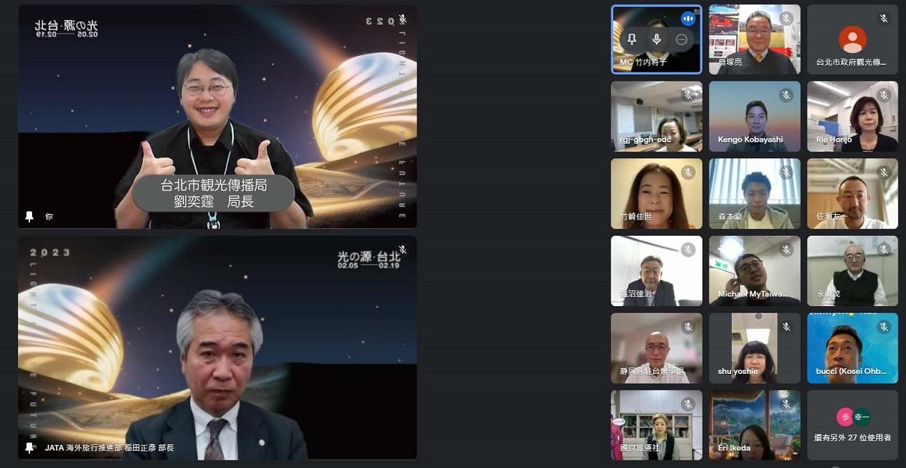 今日線上交流會由觀傳局長劉奕霆親自上線說明辦理目的,並邀請臺北市旅行商業同業公會副理事長柯牧洲、臺灣觀光策略發展協會理事長吳昭輝及臺灣inbound旅遊業代表共同參與;日方代表除了日本旅行業協會(JATA)海外旅行推進部長稻田正彥、日臺觀光促進協會事務局長時田毅親自與會之外,也有大型旅遊業者、鐵道旅遊業者、線上旅遊體驗平臺等,臺日雙方近40位觀光業重要決策者共同參與,期透過「跨海」線上交流,攜手推動臺日兩地國際觀光。