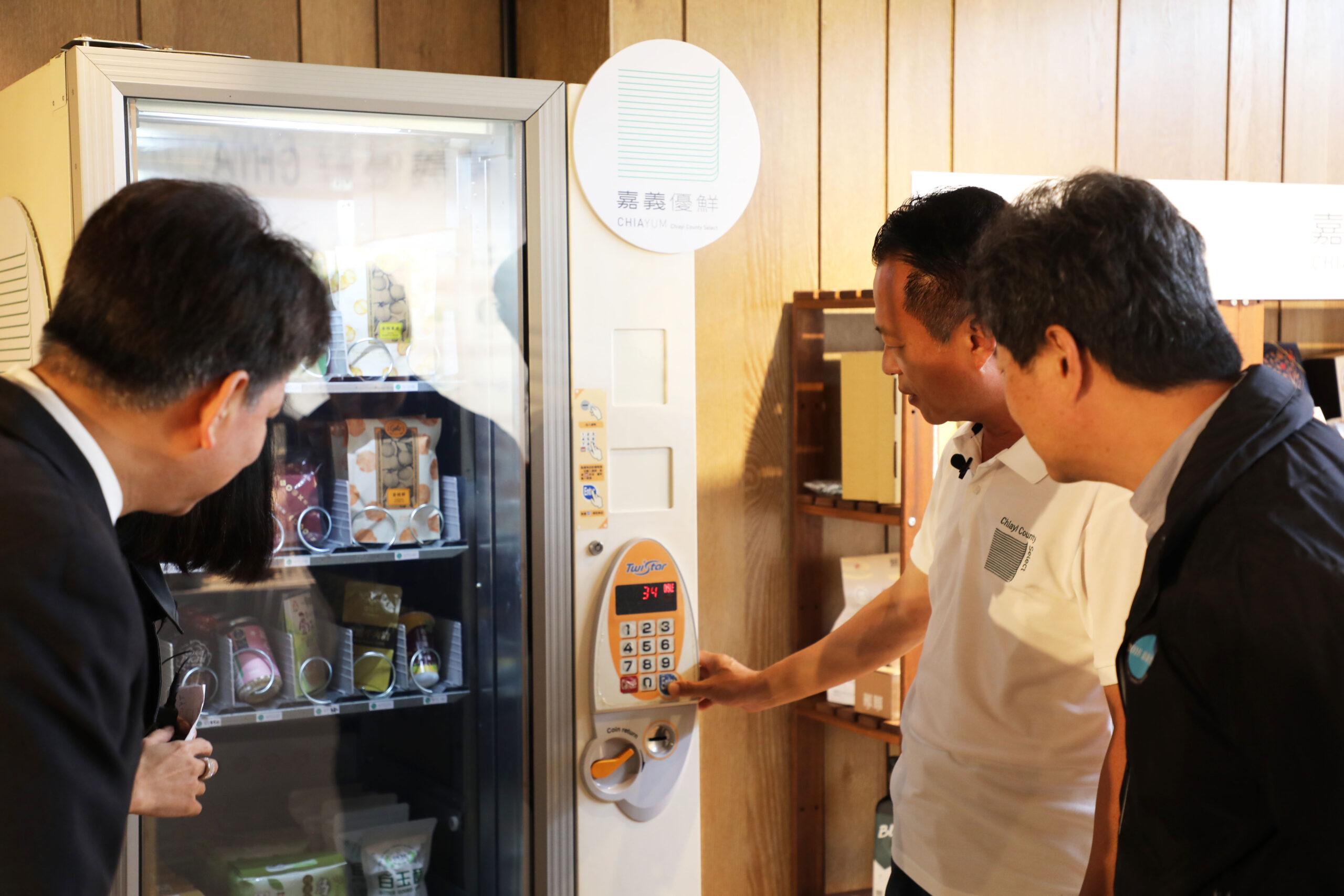 為讓旅客可以現場將嘉義優鮮的好產品帶回家,現場特別規劃設置販賣機供民眾購買,讓大家不僅看的到也買的到。直播中,翁章梁也掏出零錢示範以販賣機購買嘉義優鮮優質農產品,並選購梅山農會愛玉。