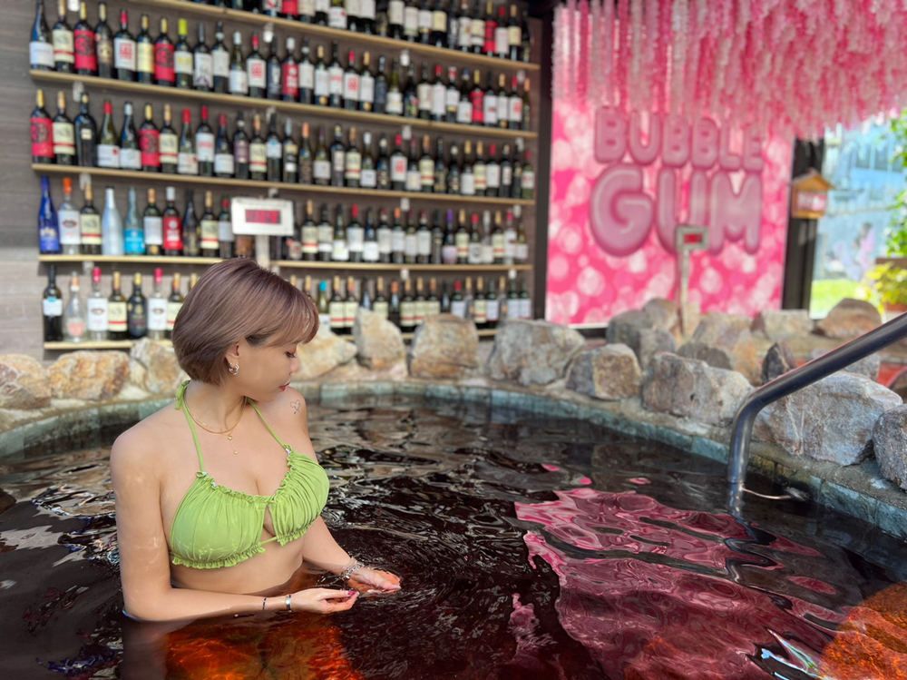而另外一池亮點則是「大人系-紅酒池」,除了有一整面的紅酒牆裝飾憑添氣氛,更加入百分百的紅酒原湯,每兩小時會再倒入一瓶紅酒,注入滿滿的紅酒多酚,盡情氤氳在酒不醉人,人自醉的慵懶情懷中。