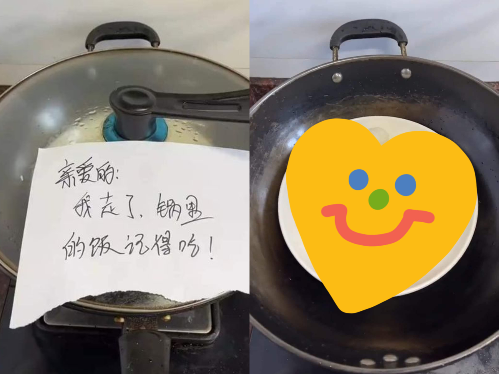 一名網友在臉書「爆笑公社2」分享最近在網路瘋傳的一組圖片,可以看到女友貼心的在廚房鍋內留著精心準備的菜餚,並且蓋上鍋蓋保溫還留下紙條「親愛的,我走了,鍋裡的飯記得吃」,但事情真有這麼簡單,充滿愛的粉紅泡泡?