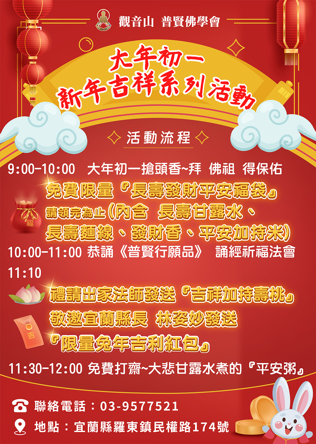 宜蘭普賢佛學會敬邀大眾大年初一搶頭香,拜佛祖得保佑,上午10點將舉辦《普賢行願品》誦經祈福,讓大眾開春就得到佛祖保佑,新的一年一切順心吉祥,並準備了長壽平安的「壽桃」和大悲甘露水煮的「彩頭平安粥」,更準備免費限量「長壽招財平安福袋」要讓大眾請領,內含長壽甘露水、長壽麵線、發財香、平安加持米,今年過年最吉祥的祝福一次獻給您,歡迎大眾蒞臨拜拜祈福。