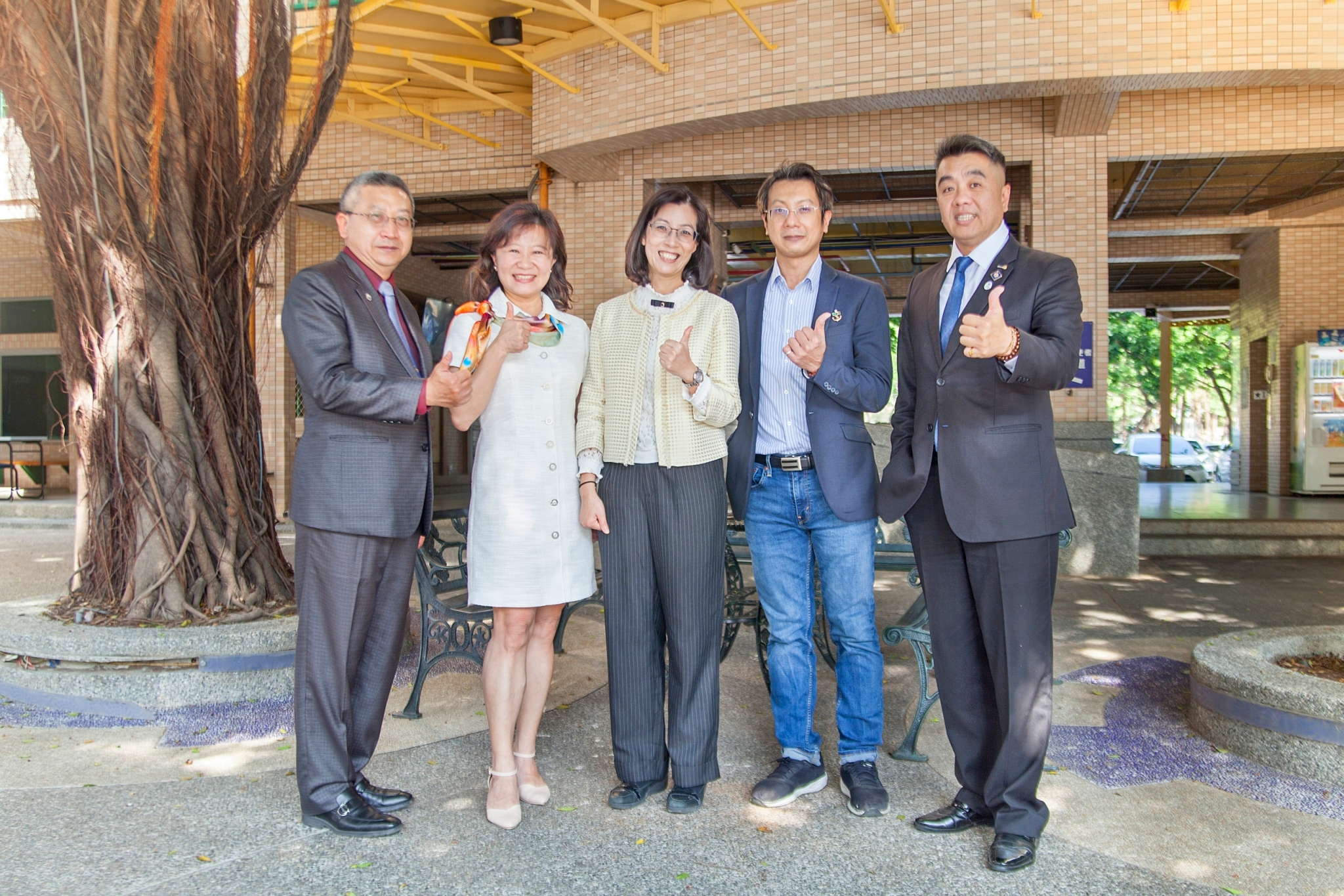 ▲國立高雄科技大學國際企業系碩士在職專班傑出校友現身說法,鼓勵職場人士重新走入校園提升自己。左起弘亨企業總經理侯春彬、英商葛蘭素史克消費保健用品地區經理于淑君、系主任李曉青、副主任鄭兆宏、韋芃企業董事長毛國輝。(圖/邱猷權攝)