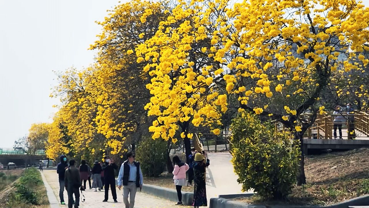 現在正值花季,嘉義市軍輝橋堤防的黃花風鈴木盛開,金黃的花色相當的耀眼,不僅白天吸引賞花的人潮,甚至連夜間都有許多遊客慕名而來。