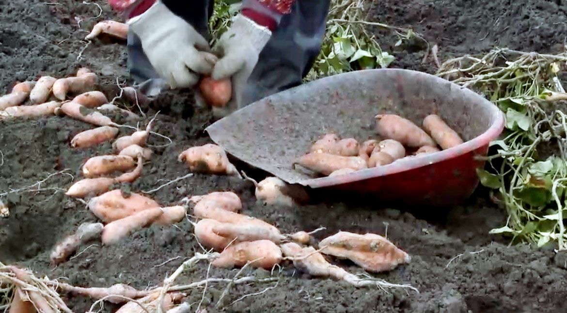 在曳引機的刨除下,在土裡的地瓜一個一個來到地面,勤快的工作人員是彎腰來撿拾可以採收的地瓜。不過今年的地瓜卻出現裂開的災情,看看一個個都開口笑的地瓜,這樣的情形可是讓瓜農笑不出來,因為這是歷年來收成最差的一年,不到二成的採收量,讓他們是相當無奈。瓜農蔡坤宗表示:「受到極端氣候影響,時冷時熱,讓地瓜出現裂開的情形,雖然產量減少但市場批發價卻也沒有提昇。」