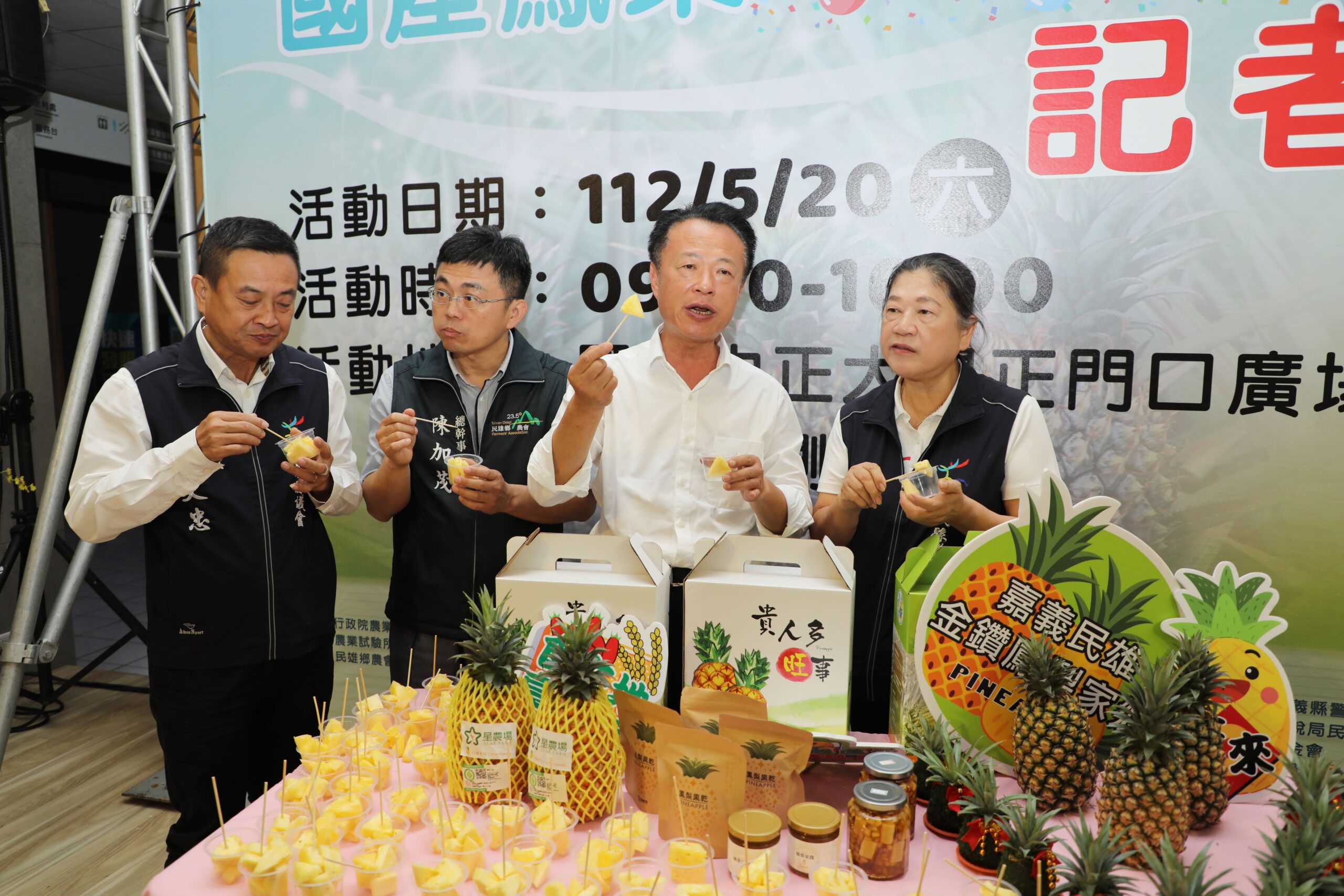 5月份正是嘉義金鑽鳳梨品質最優、口感最甜的季節,民雄鄉農會把握這段黃金期,結合產官學界盛大舉辦「食當季~享在地~鳳梨采風趣」推廣活動,邀請民眾20日到中正大學共襄盛舉,吃鳳梨消暑。10日在嘉縣府招商空間召開記者會,民雄鄉農會總幹事陳加茂大力推廣活動,縣長翁章梁會同農糧署南區分署長羅正宗、縣議員林淑完、陳文忠出席,邀請嘉義鄉親一起呷旺萊、買旺萊、年年好運旺旺來,現場也來一場削皮大比拚,農會帶來鳳梨自動削皮機請翁縣長親自操作,另一組則用刀手工削皮,互拚速度場面沸騰,自動削皮機以極快速度完勝,翁章梁不過癮也拿起刀手工削皮,切塊試吃讚不絕口。