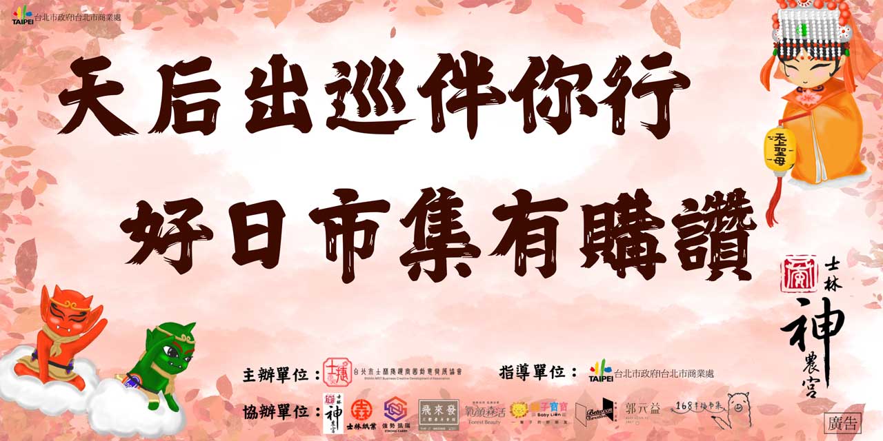 主辦單位也特別感謝多家士林在地企業協辦支持,包括士林神農宮、士林紙業、強勢凱瑞科技、飛來發足體養身會館、氧顏森活、獅子寶寶、呼吸之間、郭元益、168幸福市集,並感謝台北市政府商業處的指導,以及士林區里長及在地企業宗廟協助商圈。