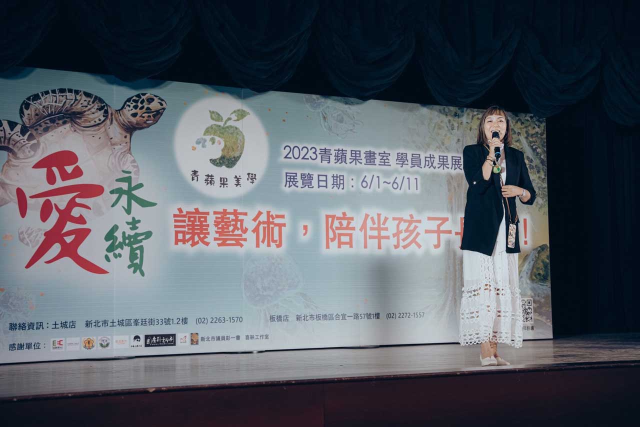 深耕新北市土城區、板橋區17年的青蘋果美術美學創辦人兼執行長張玉筠(黑妞老師),於6月4日為青蘋果美術美學教室的小小藝術家們舉辦「愛永續」開幕成果展,現場展示430位學員的創作,學員除了一般生、技職生、親子、祖孫檔外,還包含了身心障礙的孩子,希望可以透過藝術,帶給孩童療癒的陪伴、紓壓,藉由成果展給予鼓勵、自信和成就。成果展以<愛>與<家鄉-台灣>為主軸,共展出466件作品,當中幾件美展創作比賽與黏土證書的作品,更是耗時30個小時;學員透過一件件作品來傳遞藝術的力量與永續的概念。開幕當天,湧進約700位參展學童及親友觀展,相當熱鬧。