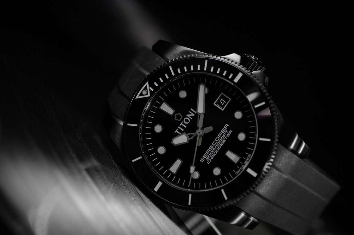 TITONI Seascoper 300 DLC全黑潛水錶限量版,為內斂低調、卻擁有無限想法和熱血的都市潛行者訂製的極致禮物。它宛如低語的山泉,謙卑而深邃,然而一旦你細細觸摸,將發現它背後隱藏的神秘面紗。外觀經典優雅,DLC黑色鍍膜凸顯內斂魅力,然而當你翻開錶背,驚喜將油然而生,揭示出豐富的真功夫經驗。錶背動態光輝線的精雕細磨,使這支Seascoper DLC限量版與以往任何一只Seascoper截然不同。不論從哪個角度觀察,總能流轉出不一樣的光澤,彷彿微風拂過湖面的漣漪。