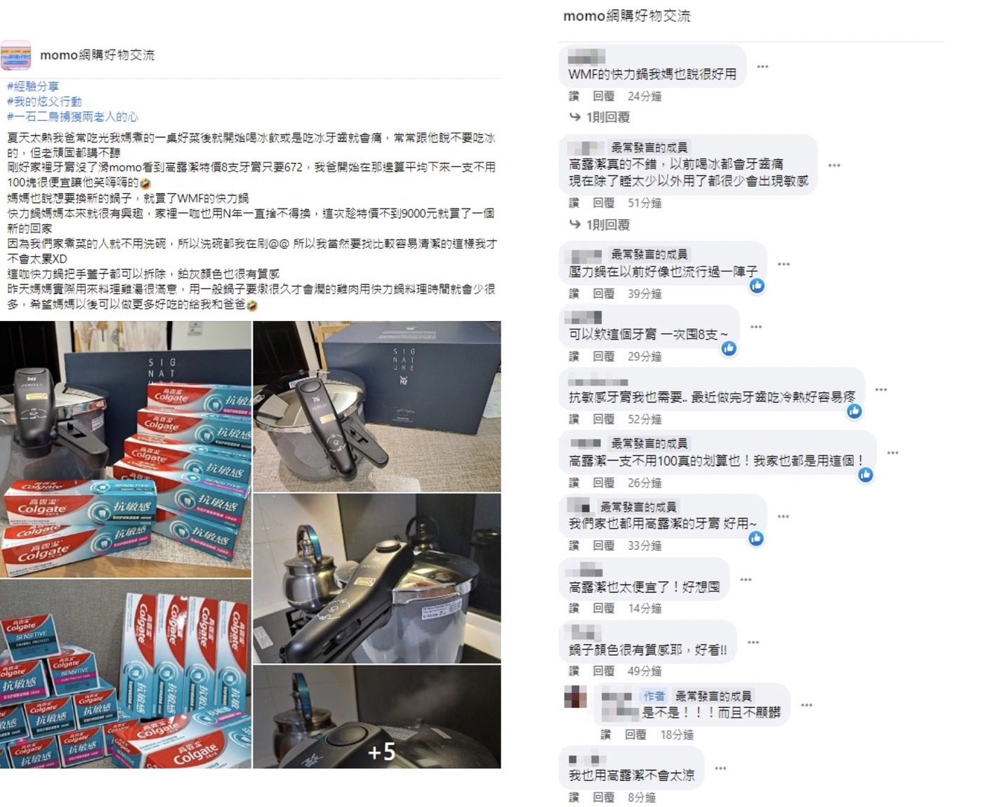女網友這個一舉兩得的好方法,獲得了不少人稱讚,而兩樣商品也有許多人推薦「女兒好孝順唷!爸爸感覺很幸福」、「家裡有老有小,真的必備高露潔抗敏感牙膏,很萬用」、「WMF的快力鍋超好用!燉肉可以很快軟嫩」。