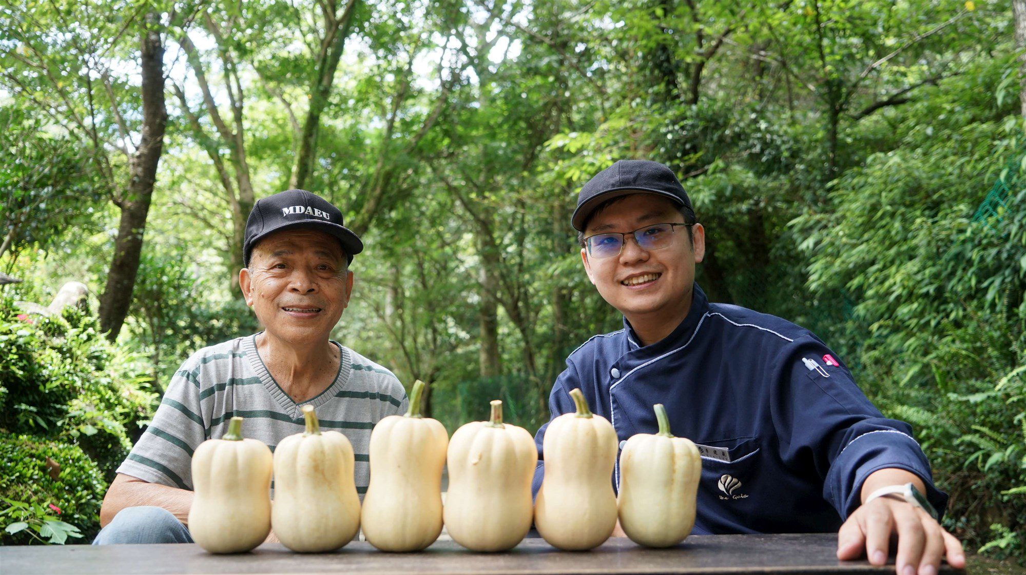 另為鼓勵使用在地食材,大地酒店本年度也與陽明山的小農何叔叔進行契作,使用純人工,無農藥植種的「菊島之樂」南瓜,研發成香醇濃郁的南瓜餅乾,9月起客房內的旅客都可品嘗得到,未來也將應用在伴手禮商品的製作。李建嶔主廚說明:「在地農家何叔叔的種植過程,堅持不使用農藥,以特製的網袋保護,每天辛勤地巡視農園,因此種出品質優良又健康養生的農產品。特殊品種菊島之樂的南瓜,外型小巧可愛,營養成分完整濃縮,口感紮實鮮甜,用這麼好的農產品,才能設計出與眾不同的伴手禮」。