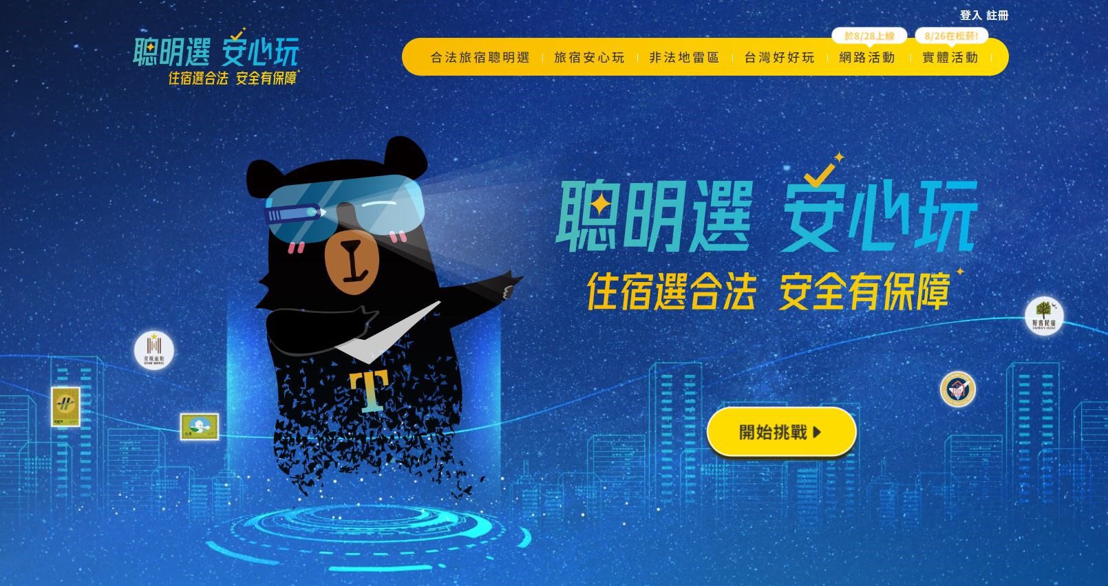 國人選擇國內旅遊,放鬆身心,在安排各項特色行程時,往往會忽略最重要的住宿環境,交通部觀光局持續鼓勵民眾於國內出遊前,先上「臺灣旅宿網」查詢住宿是否有合法登記,或是於住宿櫃台能否見到合法旅館或民宿的標章,才是最安心有保障的住宿空間。交通部觀光局為了推廣民眾認識各式合法住宿標章,於即日起至112年9月11日下午5點推出「住宿選合法 安全有保障」線上遊戲,民眾登錄後化身喔熊旅宿超人共同挑戰,只要完成積分挑戰的民眾,都能參與抽獎活動.天天玩累積分數愈高,愈有機會把價值萬元住宿券帶回家。