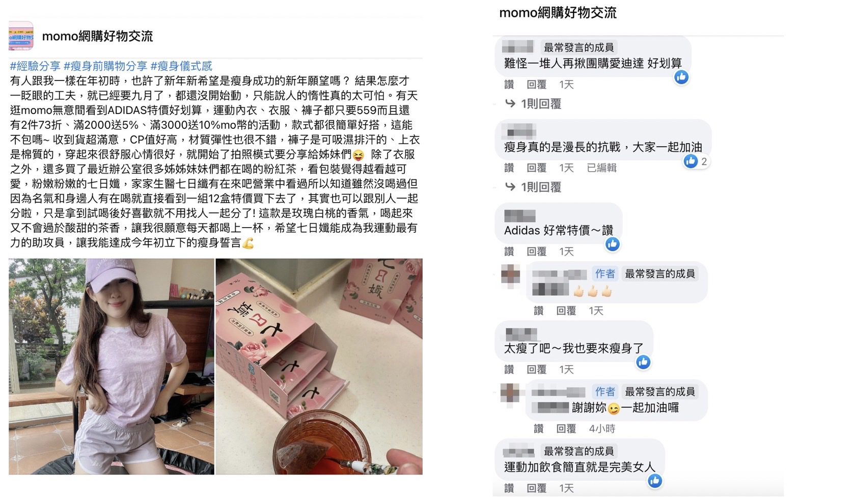 最近就有一位辣媽網友,在「momo網購好物交流」社團分享,下定決心要抓住夏天尾巴,努力實行減肥計畫的甘苦談,辣媽網友表示除了運動之外,還希望能夠事半功倍,因此下單了「家家生醫 七日孅白桃玫瑰茶包」和「ADIDAS短袖上衣/短褲組」。